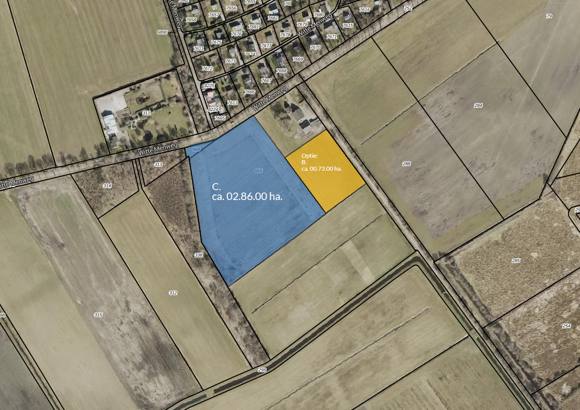 Oppervlakte van ca. 2,8 ha. perceel dient nog kadastraal gesplitst te worden, optie B. kan komen te vervallen indien het naastgelegen woonhuis verkocht wordt met deze grond.