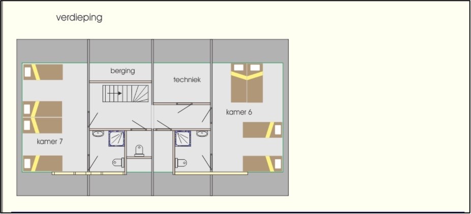 De groepsaccommodatie. Op de begane grond zijn er 4-5 slaapkamers en op de verdieping zijn er 2 slaapkamers;