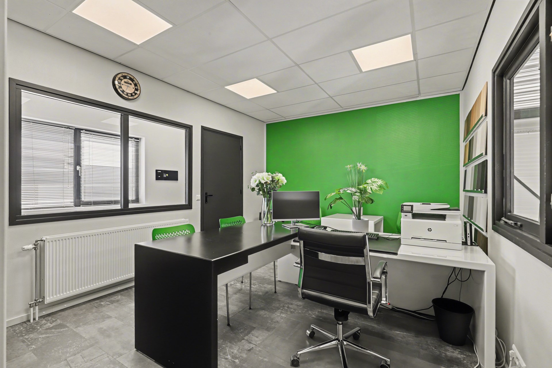 Ook het kantoor en de overige ruimten zijn praktisch uitgerust, onder meer met centrale permanente afzuiging in kantoor en toilet met afstandsbediening, jaloezieën, een inpandige brievenbus, een sleutelkluis en diverse inventaris, waaronder bureau’s, stoelen en magazijnrekken.