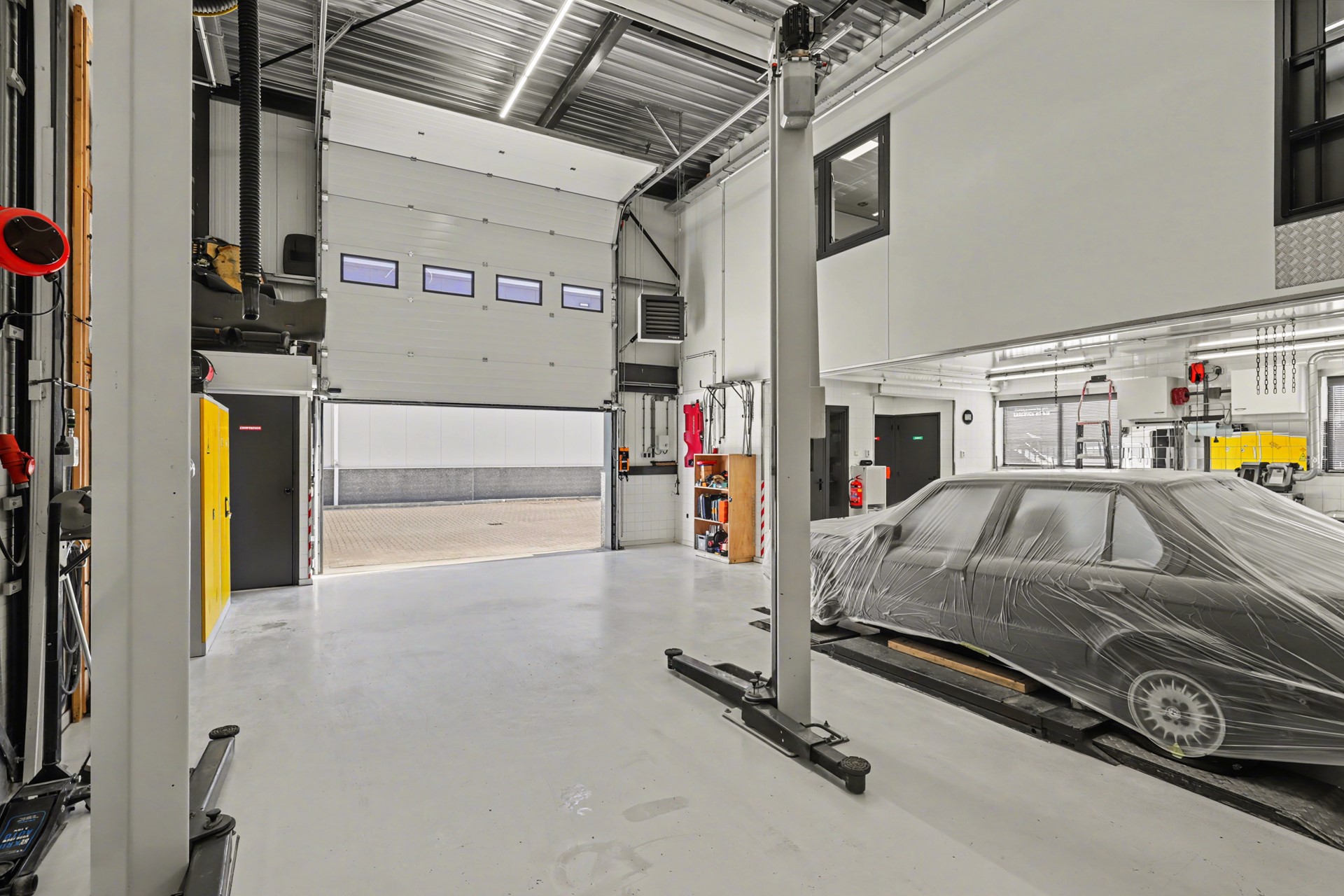 Daarnaast zijn aanwezig: een compressor met droger, een spuitwand, een werkbank met afzuiging in de spuiterij en een voorbereiding voor een lichtstraat. Op de bovenverdieping bevinden zich een keuken-/kantine-/kantoorruimte, extra magazijnruimte en een aansluiting voor lucht en 1x 380 volt.