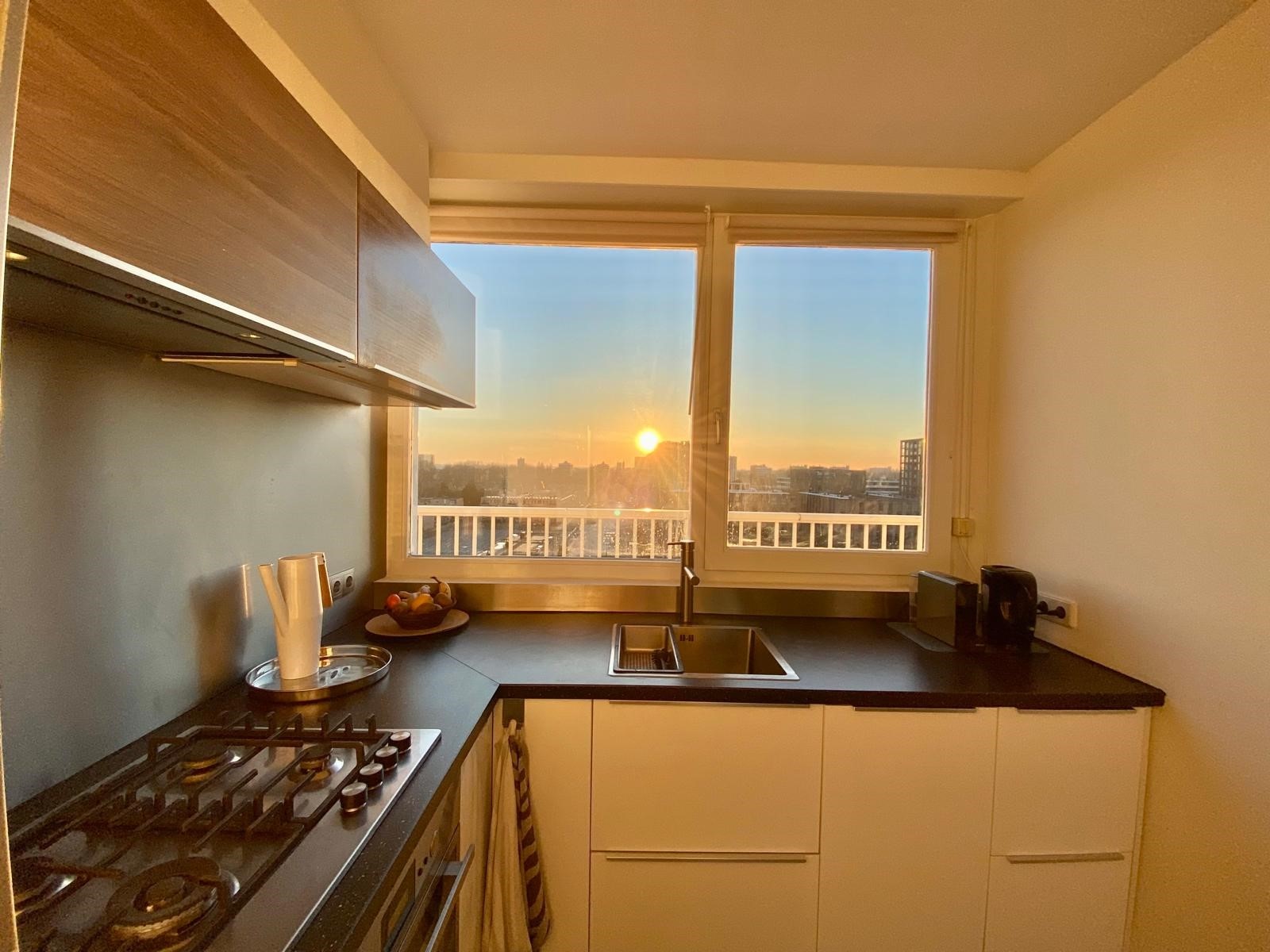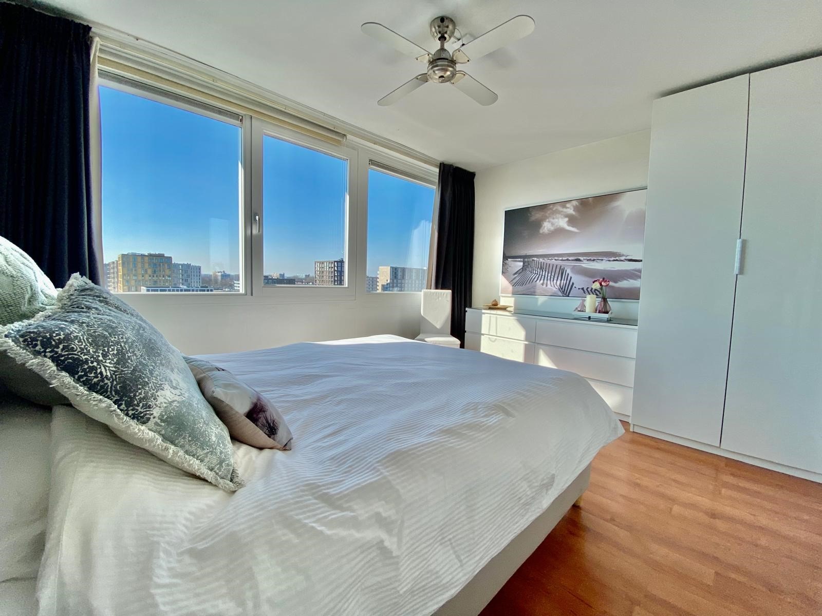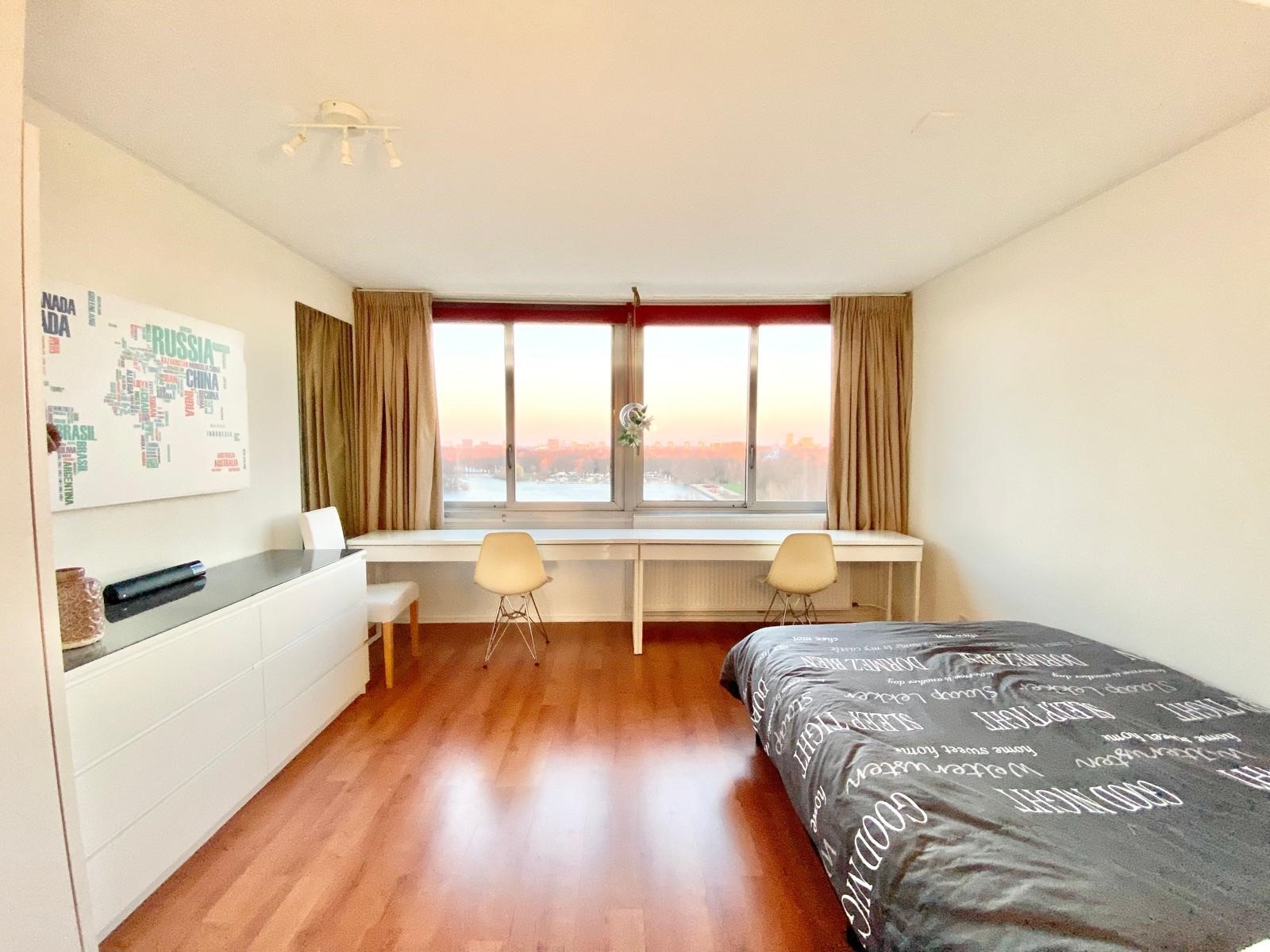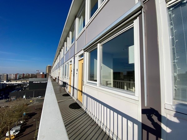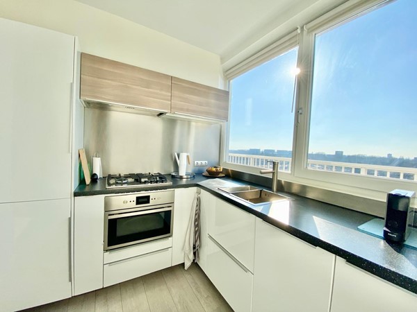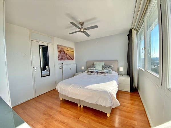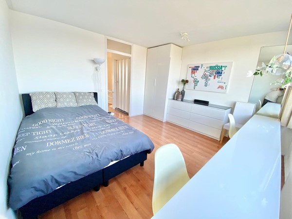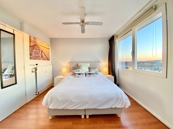 On the 10th and 11th floors of a neatly maintained apartment complex with elevators, we find this beautiful 2-bedroom maisonette apartment. We enter the spacious living room with an open kitchen, equipped with a variety of built-in appliances. Through the lounge area we reach the balcony with automatic sun blinds and a beautiful unobstructed view over the Sloterplas!