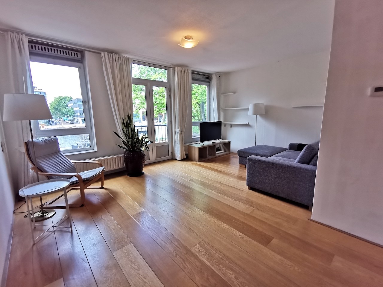 The living room has a sitting area with a television setup and a French balcony with a view of the Oostenburgergracht. We also find a dining room table and chairs on the kitchen side of the living room. The kitchen itself is equipped with a variety of built-in appliances and gives access to the balcony, just like the bedroom.