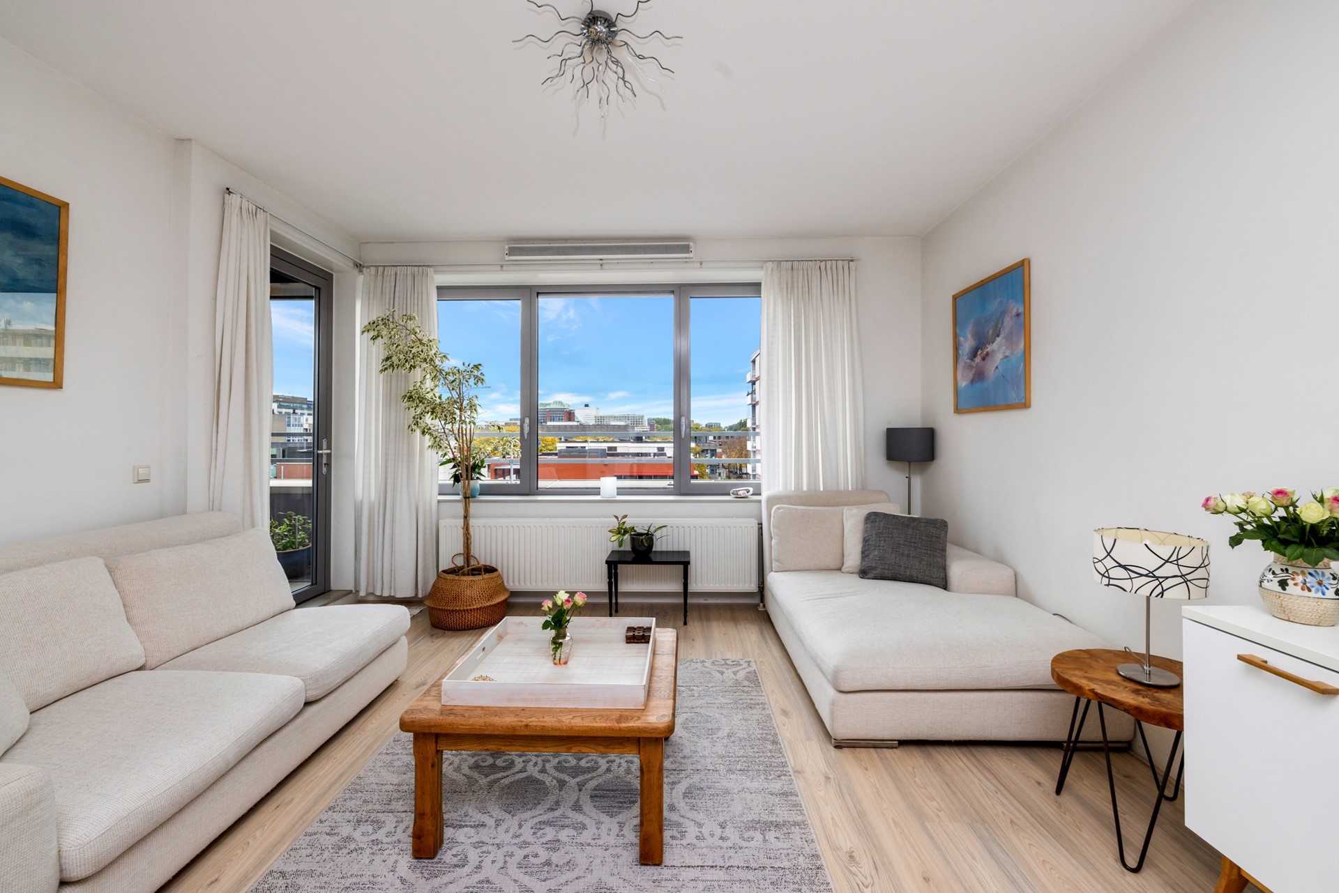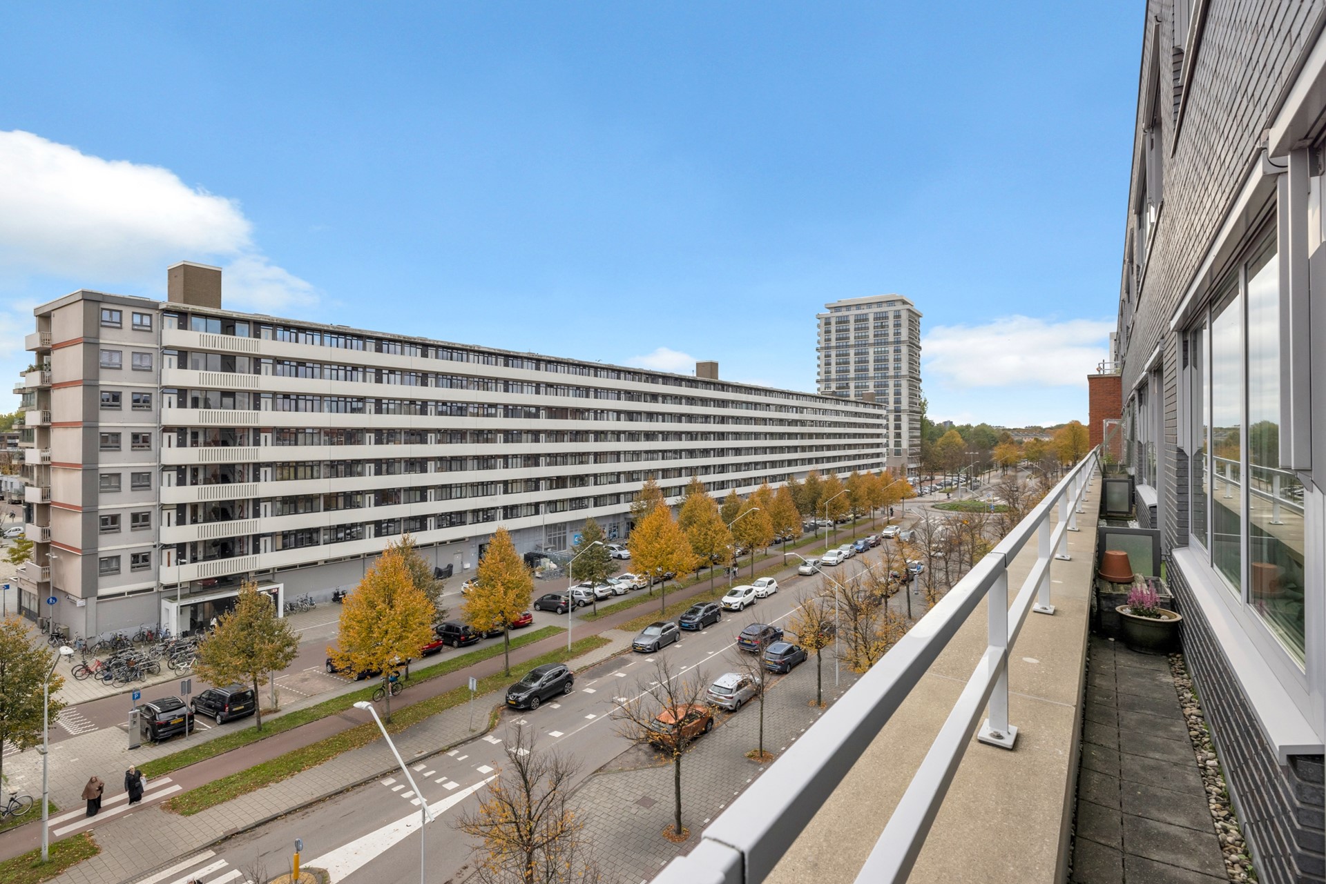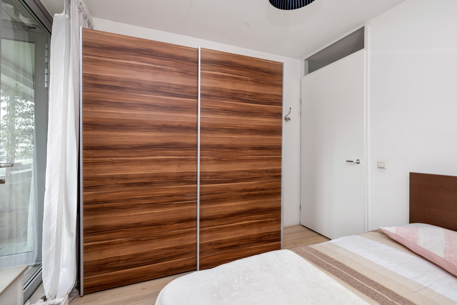 The apartment has bright finishes. It features an open-plan kitchen with various appliances, including an oven, ceramic hob, and dishwasher. There's also a built-in refrigerator and ample cupboard space. The balcony is accessible from both the living room and the bedroom, offering unobstructed views of the surrounding area.