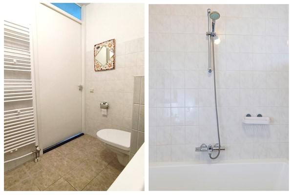 The bathroom is also accessible from the hall. It is spacious and features a wall-hung toilet, a beautiful double vanity, a designer radiator, and a bathtub.