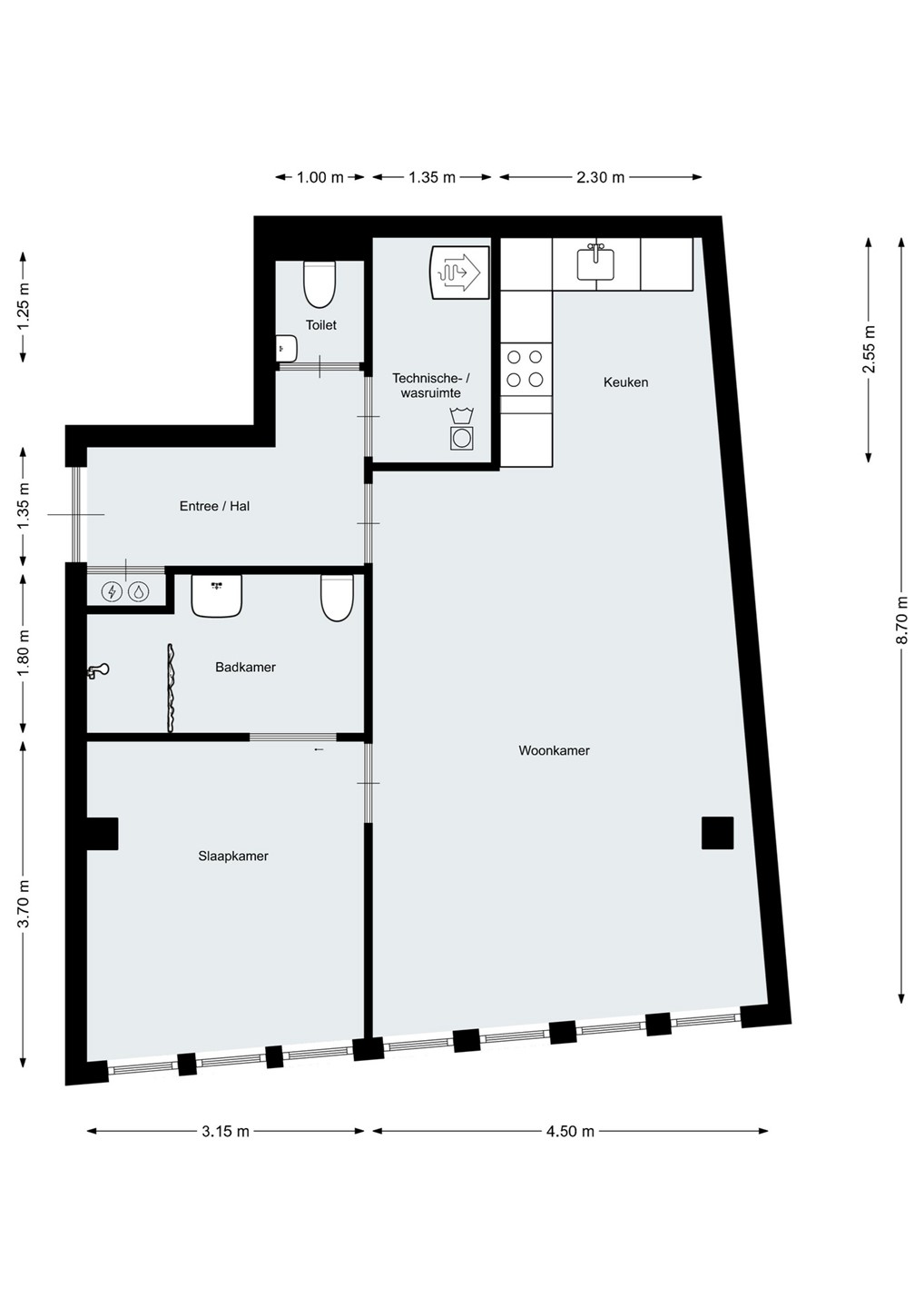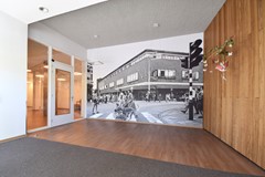 Via de brede voordeur kom je het appartement binnen. De hal geeft toegang tot de woonkamer, de meterkast, het toilet en de technische/wasruimte.