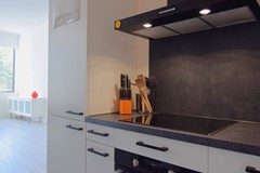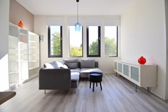 Opvallend lichte woonkamer. Het daglicht kan goed binnenstromen door de 4 hoge ramen wat een statig beeld geeft aan het appartement. De kamer is fijn in te delen met een ruime zit-en eethoek. De woonkamer staat in open verbinding met de keuken en geeft toegang tot de slaapkamer.