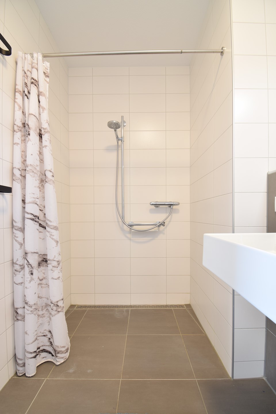 De ruimte is afgewerkt met een tegelvloer, betegelde wanden en een spuitwerk plafond.