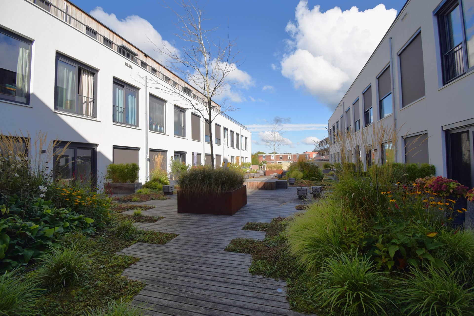 Er zijn leuke zitjes gemaakt en er is het nodige groen aangelegd.