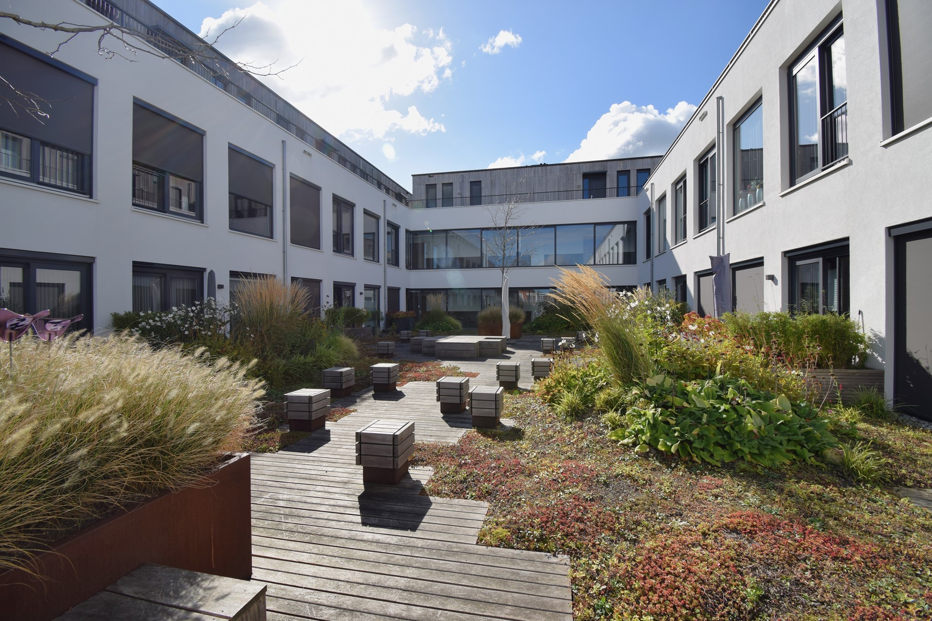 Op het binnenterrein/dakterras van het complex is er een tuin gecreëerd waar alle bewoners gebruik van mogen maken.