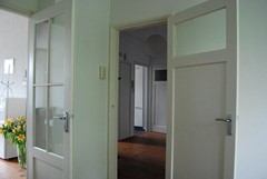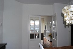 De royale woonkamer, met 3 vaste kasten, is verdeeld in een voor- en achterkamer en heeft tevens toegang tot het balkon.