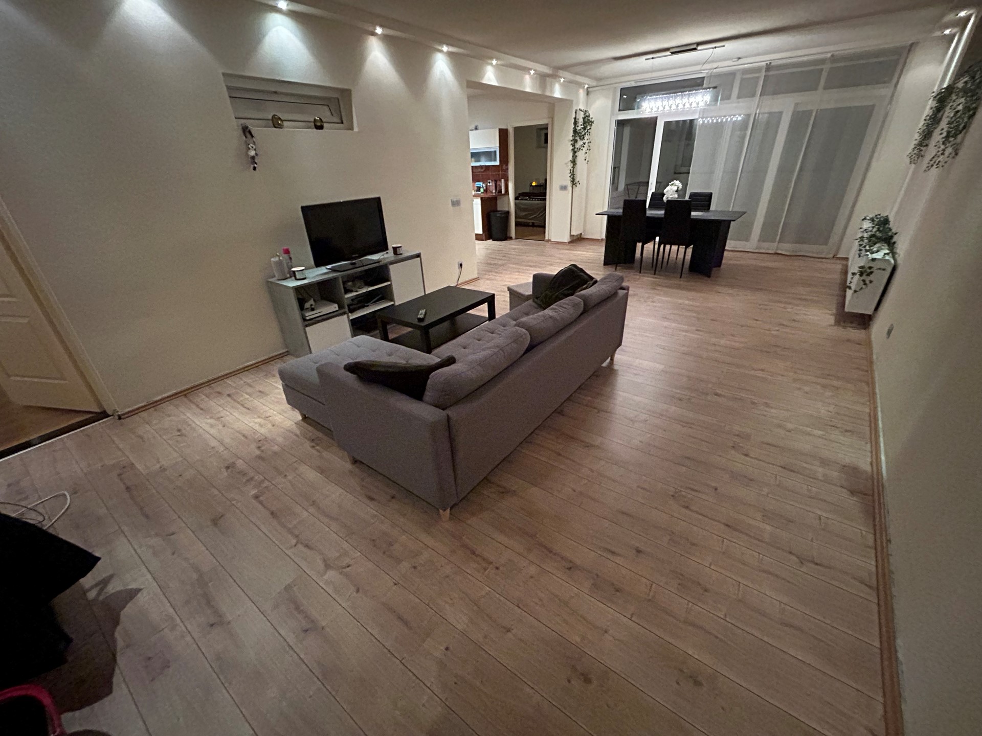 Woonkamer 85,0 x 4,25 met laminaatvloer, inbouwspots, schuifpui naar veranda en open keuken.