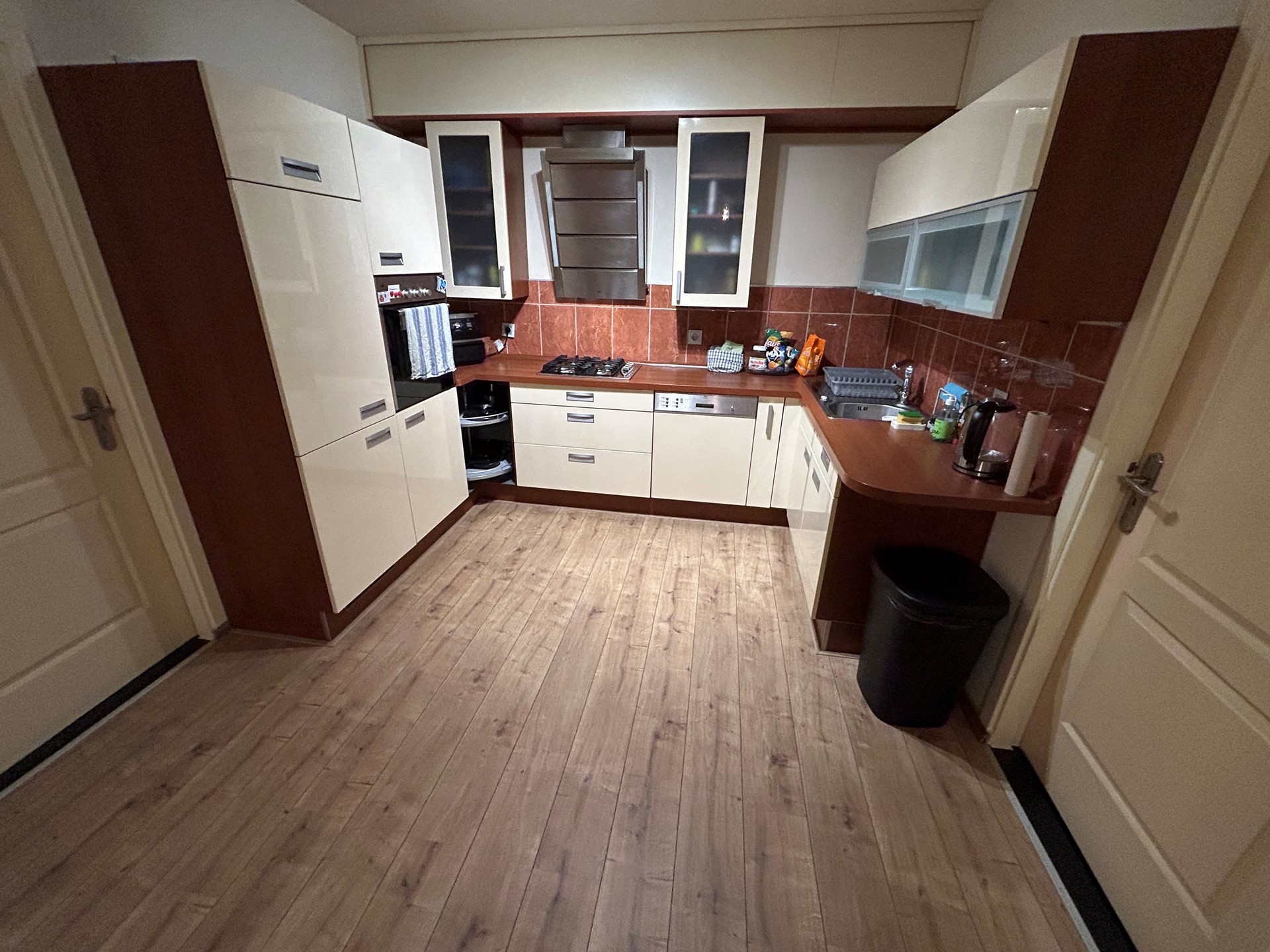 Keuken 3,35 x 3,15 met laminaatvloer, deur naar beide slaapkamers en mooie hoogglans aanbouwkeuken met 4-pits gasfornuis met moderne afzugunit, vaatwasser, heteluchtoven, koel/vriescombinatie, draaideurcarrousel, apothekerskastje en spoelbak.