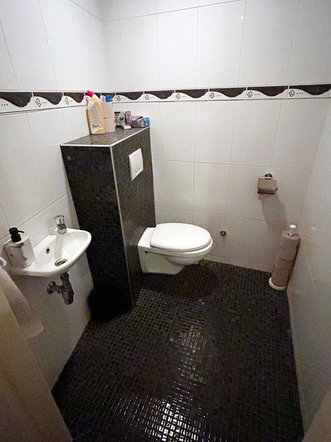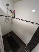 Badkamer 3,10 x 1,60 met mozaïekvloer, inloopdouche, badkamermeubel met wastafel, aansluitingen was-apparatuur en design radiator.