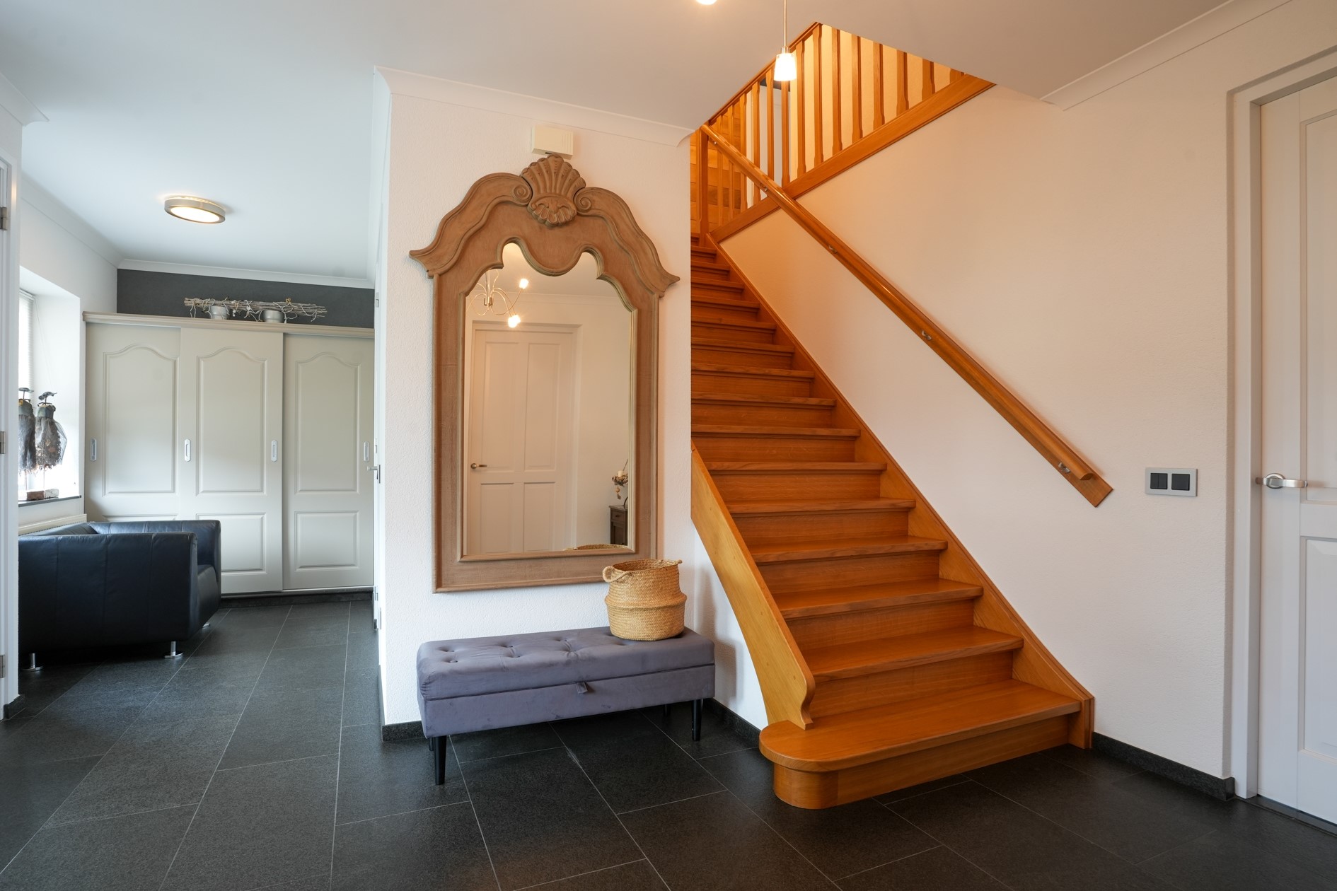 Dit fraaie woonhuis heeft een dubbele entree aan de kant van de Rijksweg. In het linkerdeel is de entree van het woongedeelte en bij het rechterdeel is de entree van het kantoorgedeelte. Eerst gaan we naar het woongedeelte, waar u als eerste in de zeer royale ontvangsthal staat. Hier zijn de meterkast, het gastentoilet, een maatwerk garderobe en de prachtige trap naar de eerste verdieping.