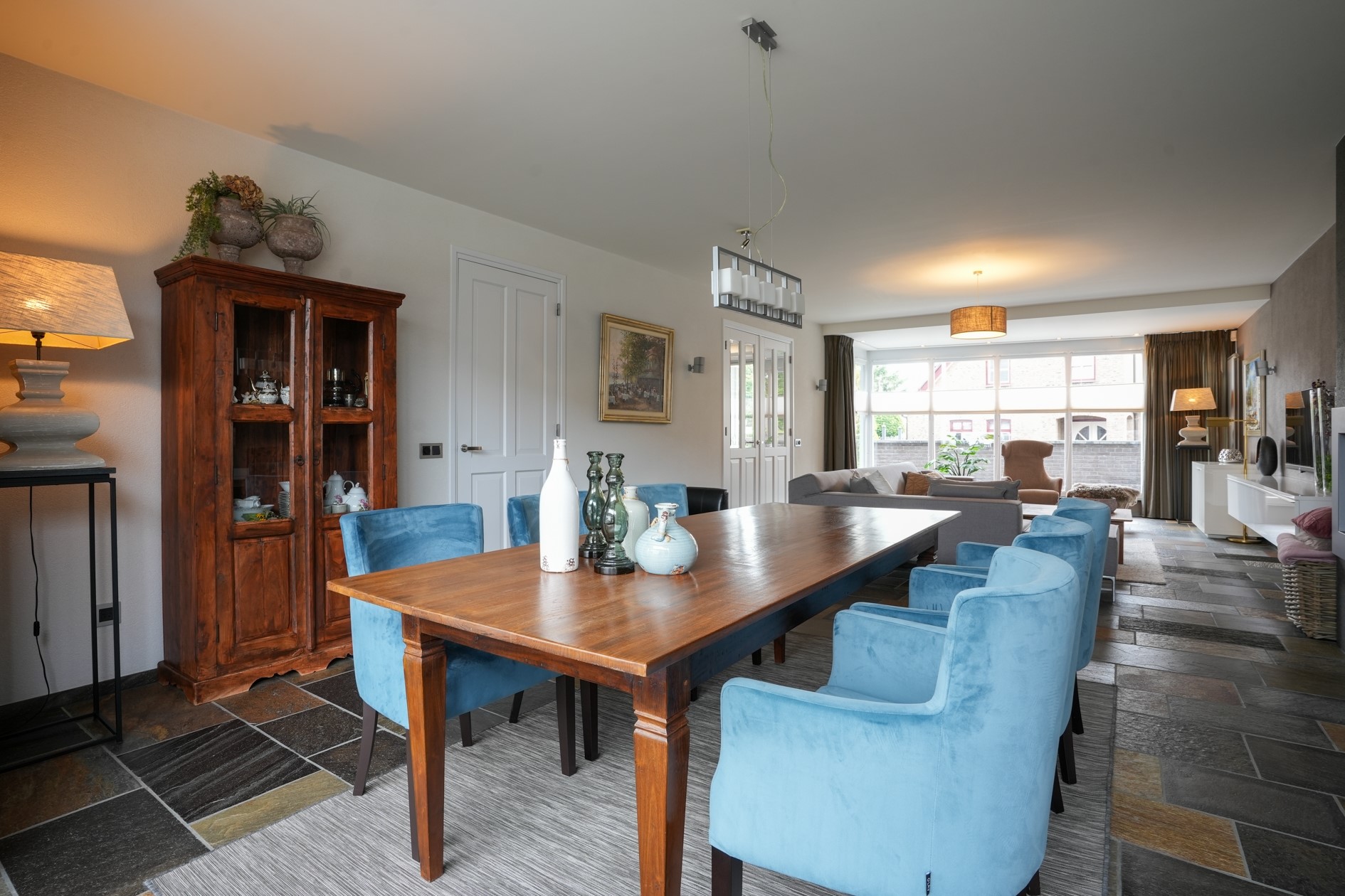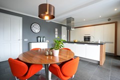 De eetkeuken is een stijlvolle ruimte met openslaande deuren naar het terras. Er is genoeg plek voor een eettafel en de keukenopstelling met kook-/spoeleiland is van topkwaliteit. Aan bergruimte is geen gebrek en de inductie kookplaat, afzuigkap, Quooker, vaatwasser, combi-oven, koelkast en vriezer zijn ingebouwd. Naast de keuken is een praktische bijkeuken, waar een pantry met een spoelbak staat.