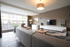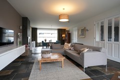 Rechts in de hal is een deur naar de sfeervolle woonkamer, waar een donkere leisteen vloer ligt. De kleuren op de wanden en de schouw zijn zorgvuldig afgestemd op de vloer. Zowel het zitgedeelte als het eetgedeelte heeft een ruime opzet, met een gashaard als centrale plek. Geniet van de sfeer, de ruimte en de goede lichtinval.