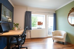 Het rechterdeel van de begane grond, met een eigen entree, is zeer geschikt als kantoor/praktijk. Er ligt een granieten vloer, de plafonds zijn voorzien van lichtinval en er is een eigen toiletruimte. Een grote kastenwand biedt volop bergruimte en bij het ontwerp is goed gekeken naar lichtinval.