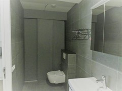De badkamer heeft een installatie kast met schuifdeuren waar achter zich de warmtepomp en de aansluiting voor de wasmachine zich bevinden.