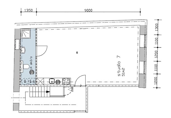 Grote leefruimte, 45 m2 (circa 9.00 x 5.00 m).