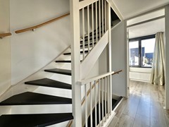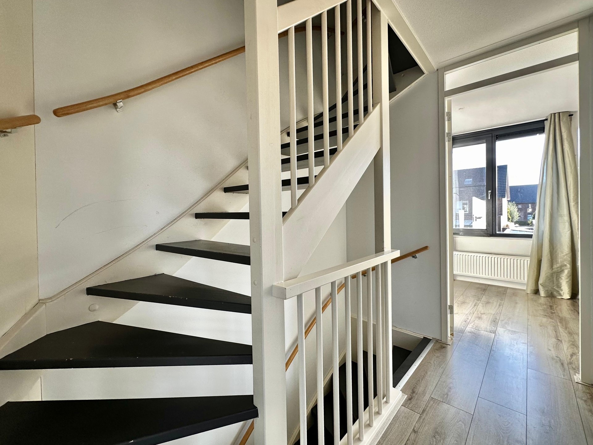 Via de entree bereik je de hal met toegang tot een separaat toilet. De ruime woonkamer van circa 36,5 m² is licht, overzichtelijk en voorzien van een praktische trapkast voor extra bergruimte.