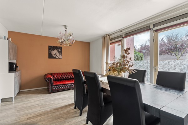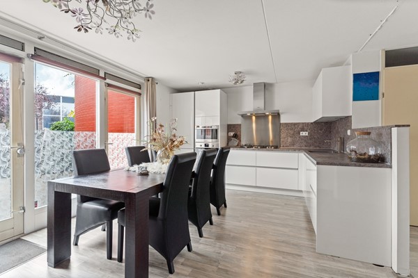 Met een woonoppervlakte van 110 m² biedt deze woning verrassend veel leefruimte. De doorzonwoonkamer is licht en prettig ingedeeld en directe toegang tot de tuingerichte woonkeuken. De witte hoekkeuken is voorzien van moderne inbouwapparatuur – perfect voor wie graag kookt en geniet van gezellig tafelen met uitzicht op de tuin. Praktische kast met vloertegels en aansluiting voor de wasmachine.