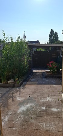 Achtertuin met terras, bestrating, beplanting en achteringang.