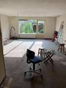 Woonkamer met berging onder trap naar verdieping, veel lichtinval, tuincontact en open keuken.