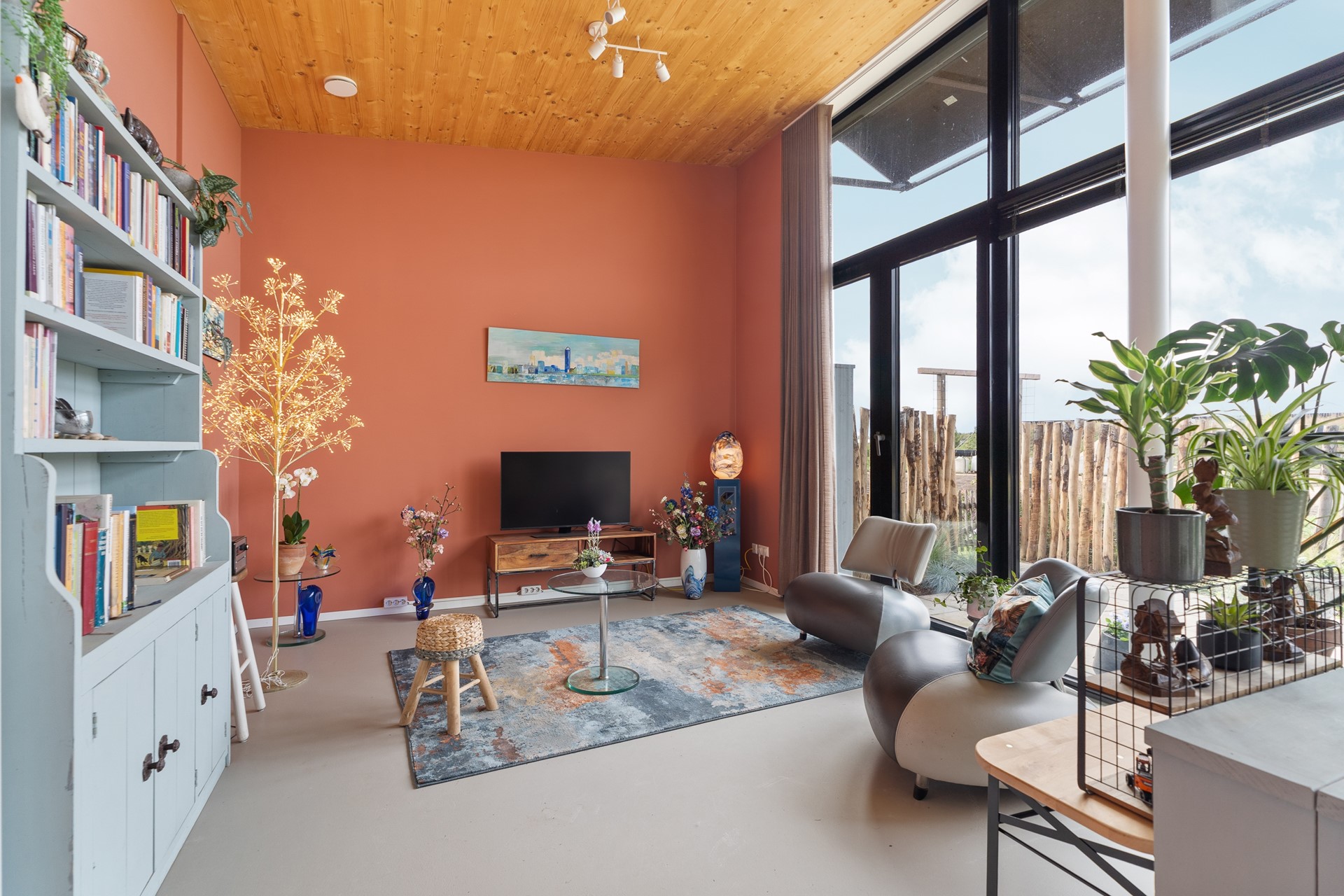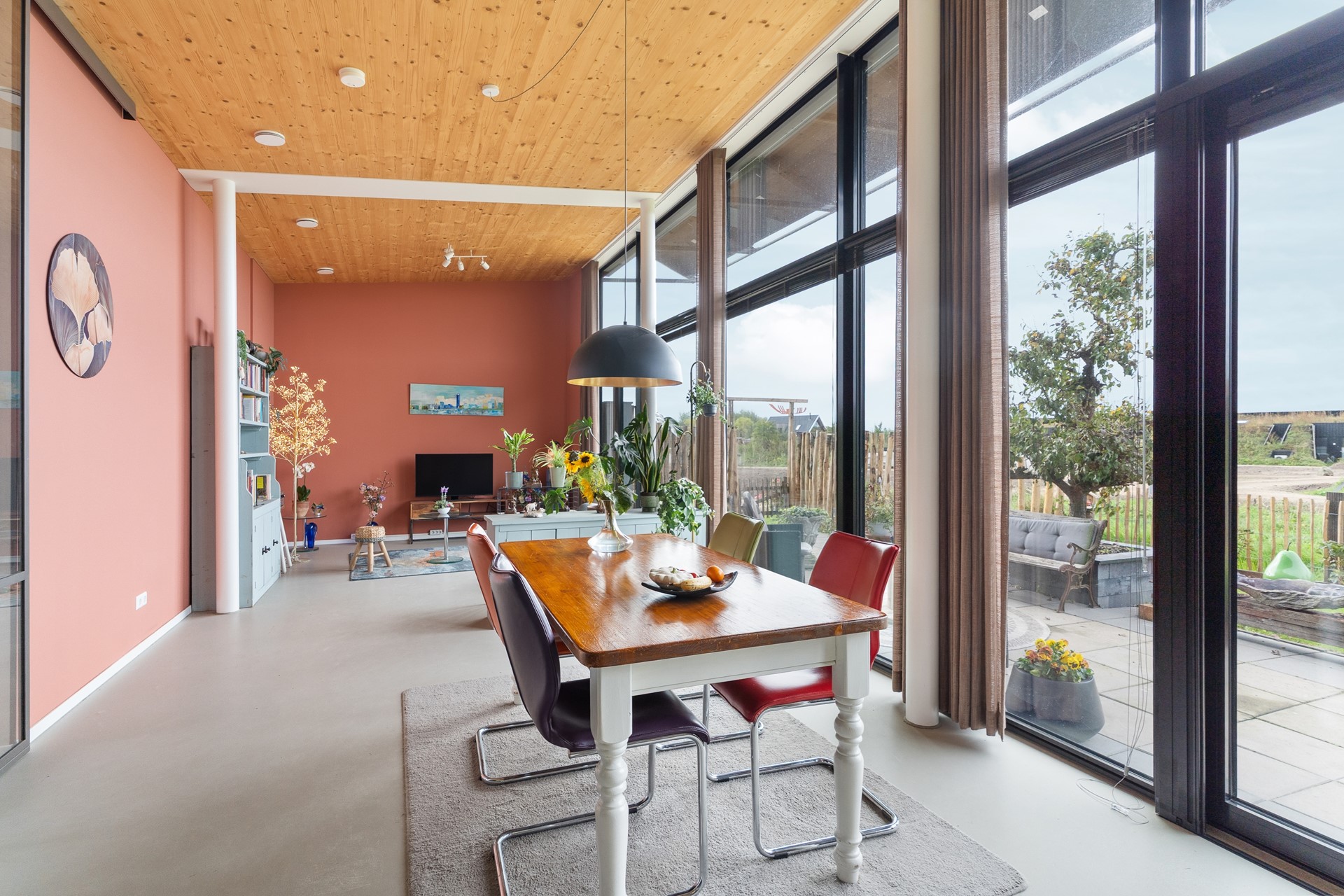 Aan de rand van Almere Oosterwold ligt Dorpslandgoed ’t Eemgoed, een uniek woonconcept dat duurzaamheid en gemeenschapszin verbindt met hoogwaardige architectuur. Deze hoekbungalow van 83 m² combineert modern comfort met een landschappelijke woonervaring. De woning is gebouwd in 2021 en in 2022 opgeleverd, met oog voor detail en toekomstbestendigheid. De lessenaarskap en de tien meter brede glazen pui met HR++ glas zorgen voor een ruimtelijk gevoel, overvloedig daglicht en een vloeiende overgang tussen binnen en buiten.