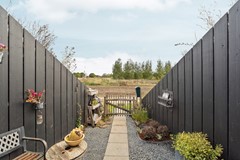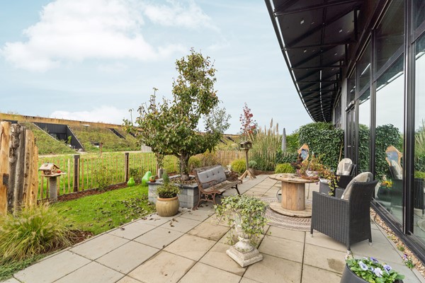 De privé-tuin van circa 70 m² is natuurlijk aangelegd met terras, gazon en vaste beplanting en grenst direct aan het gemeenschappelijke groen van het landgoed afgescheiden door een lage hekwerk. Hier woont u niet alleen in de natuur, maar ook mét de natuur.