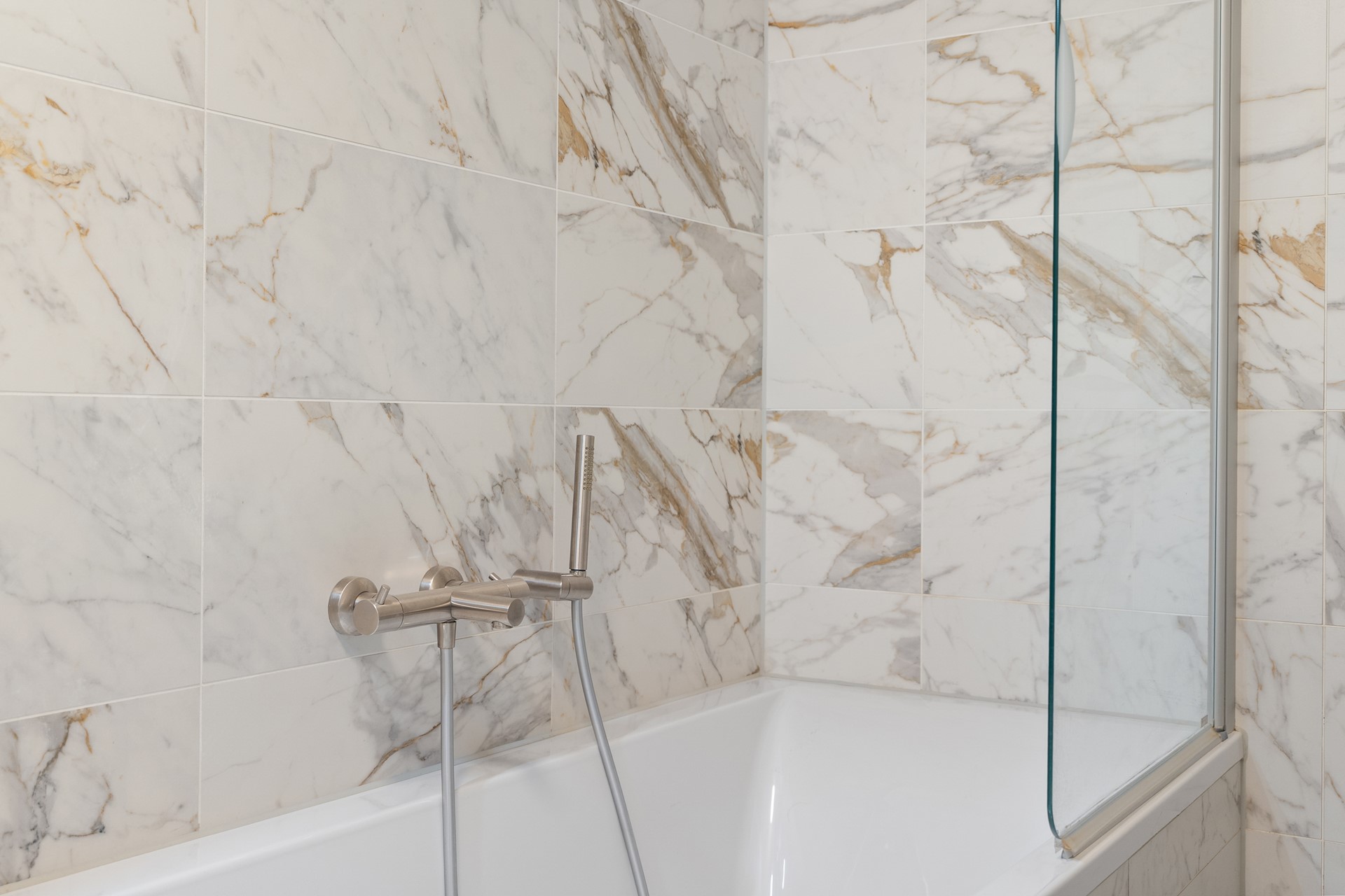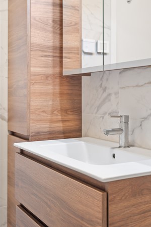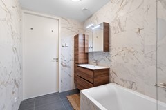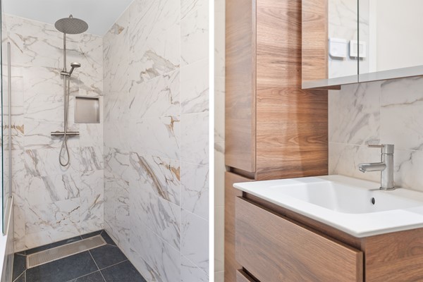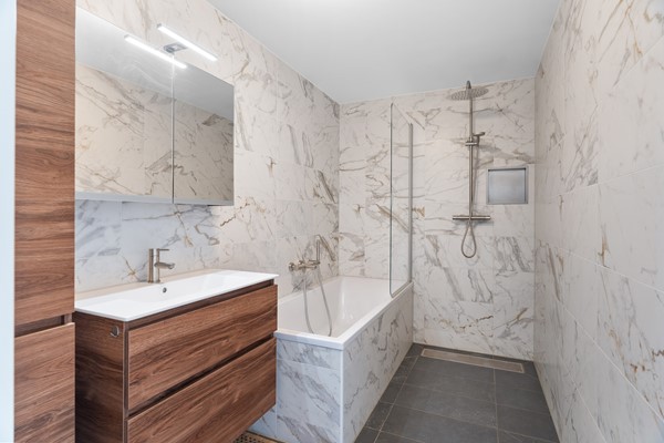 Badkamer met ligbad, inloopdouche en modern wastafelmeubel