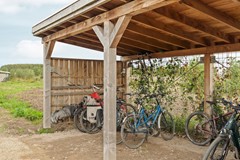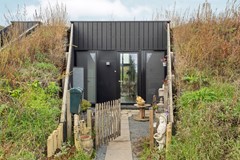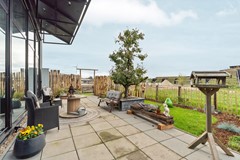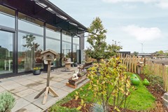 Entree aan de voorzijde met trapeziumvormige, fraai aangelegde patio. Vanuit hier heeft u uitzicht op de vijver en het voedselbos. Via de hal kunt u de gehele woning bereiken: twee slaapkamers en de technische ruimte aan de voorzijde, badkamer en apart toilet in het midden en de woonkamer met open keuken aan de achterzijde. De lessenaarskap zorgt voor een ruimtelijk gevoel in het woongedeelte. Er is opbergmogelijkheid in de hal onder het dak.