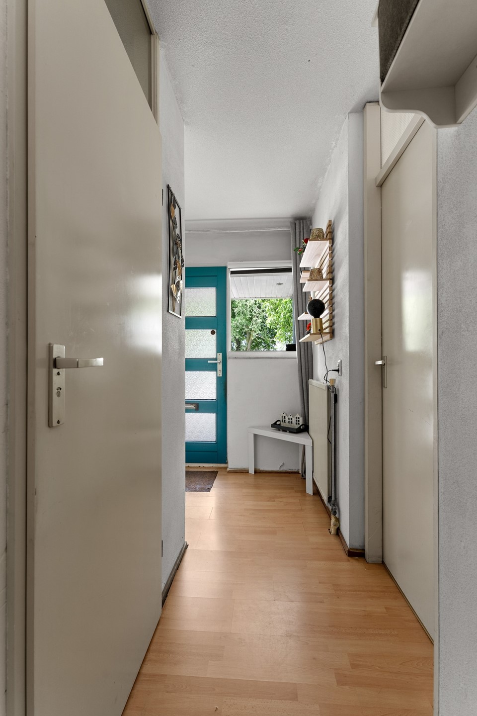 De overdekte entree met voordeur biedt toegang tot de woning. In de hal bevinden zich de meterkast, het toilet met fonteintje en de toegang tot zowel de keuken als de woonkamer. De woonkamer is licht en ruim, voorzien van een open haard en een dubbele aluminium schuifpui naar de tuin. De keuken aan de voorzijde is compleet uitgerust met een oven, gaskookplaat, afzuigkap, vaatwasser en voldoende werk- en bergruimte. De inpandige garage is bereikbaar vanuit de hal en ook van buitenaf (met nieuwe segmentdeur), ideaal als bijkeuken of extra opslagruimte.