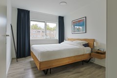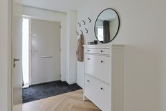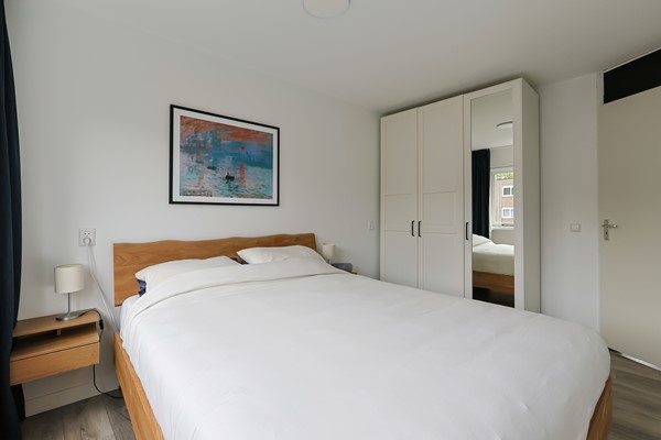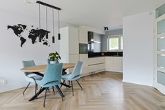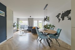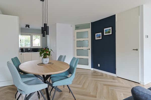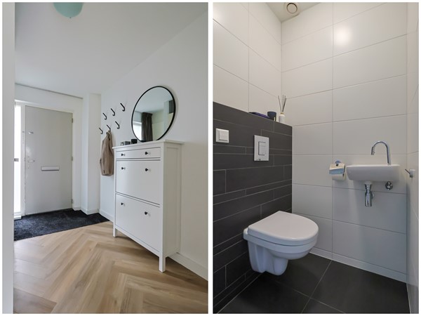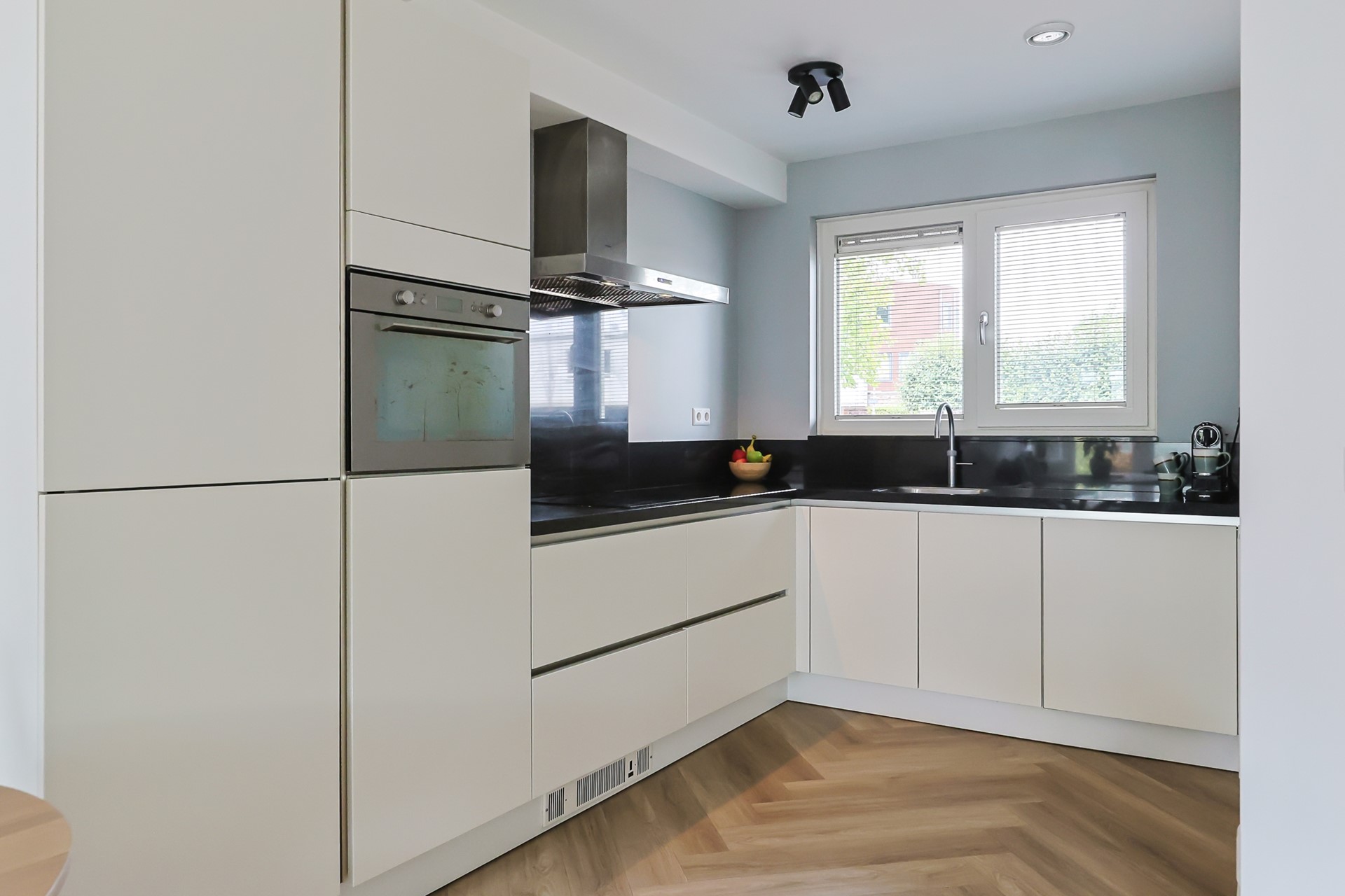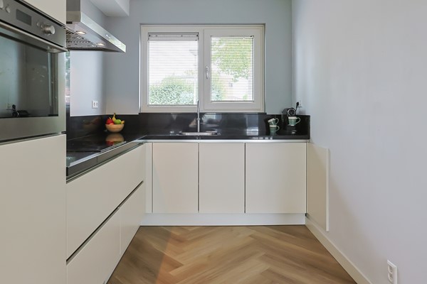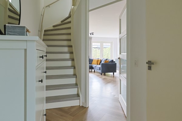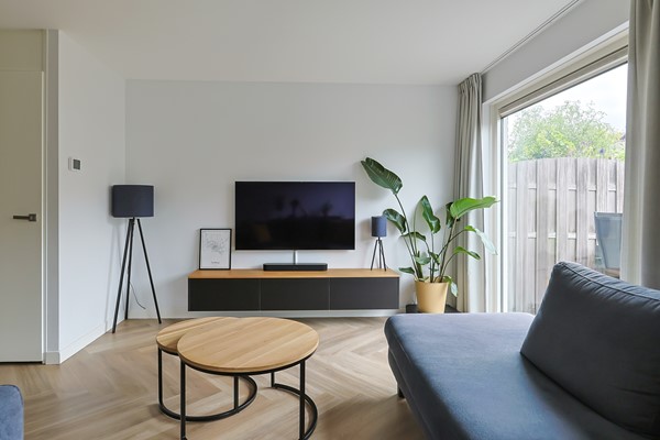 Entree via een lichte hal met meterkast en toilet (hangend, met fonteintje). Aan de voorzijde ligt de moderne keuken met prettig uitzicht op het woonerf. De woonkamer is tuingericht, strak afgewerkt en voorzien van grote ramen en openslaande deuren naar de achtertuin. In 2023 zijn vloerverwarming, een visgraatvloer en kunststof kozijnen aangebracht.