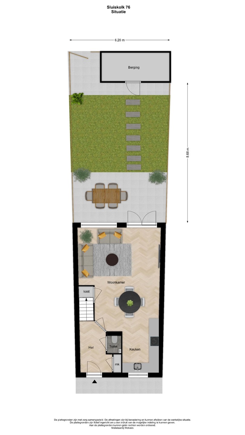 Alle verstrekte informatie moet beschouwd worden als een uitnodiging tot het doen van een bod of om in onderhandeling te treden. Deze informatie is met de nodige zorgvuldigheid samengesteld. Er wordt echt geen enkele aansprakelijkheid aanvaard voor enige onvolledigheid, onjuistheid of anderszins, dan wel de gevolgen daarvan. Alle opgegeven maten en oppervlakten zijn indicatief. In de koopakte zullen de gebruikelijke clausules worden opgenomen.