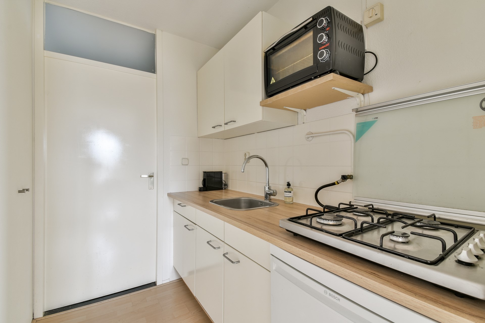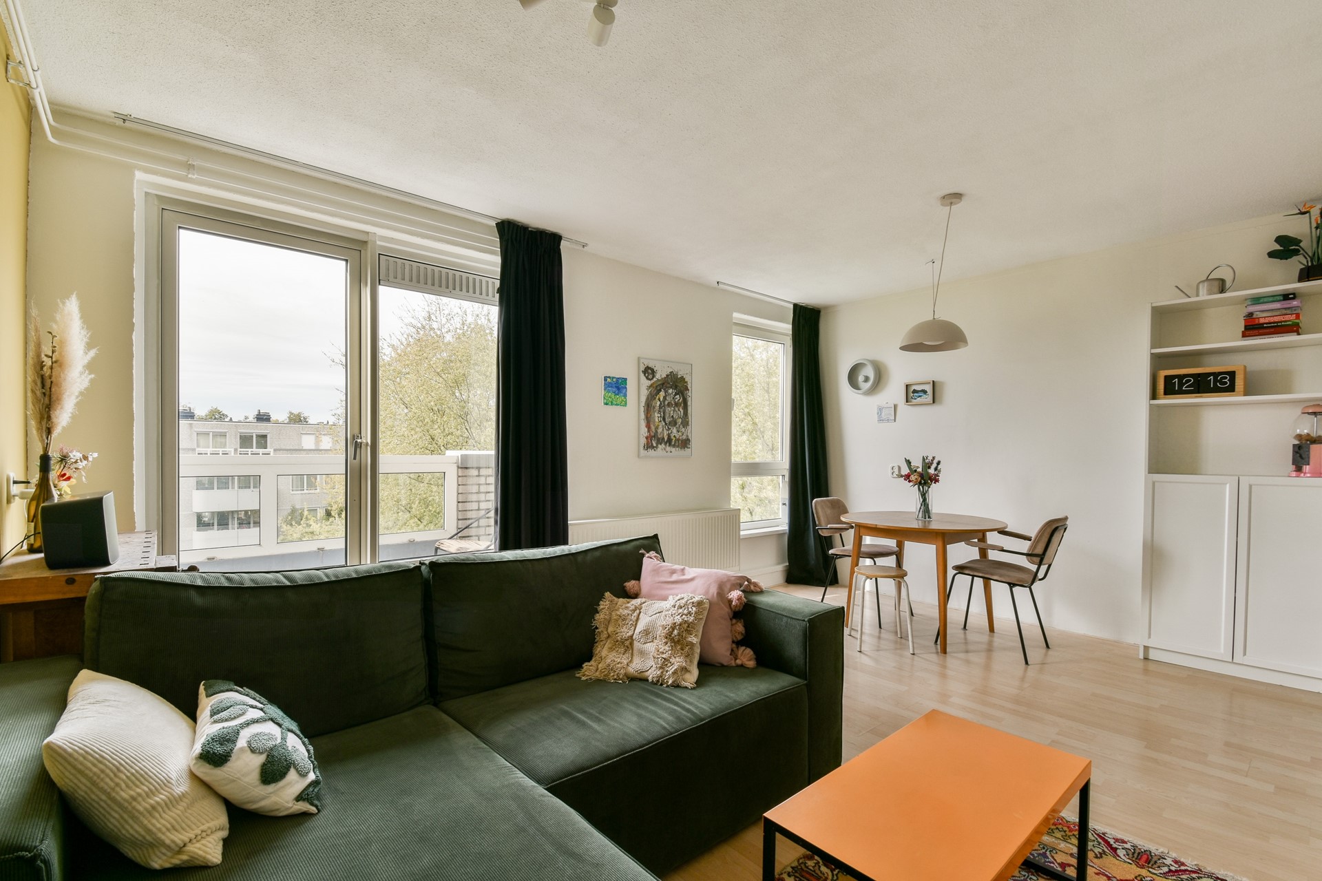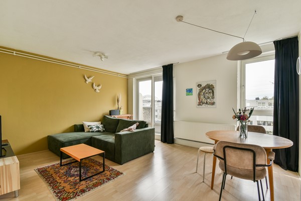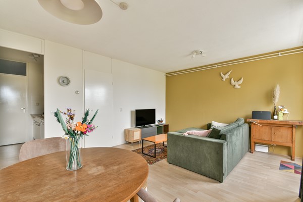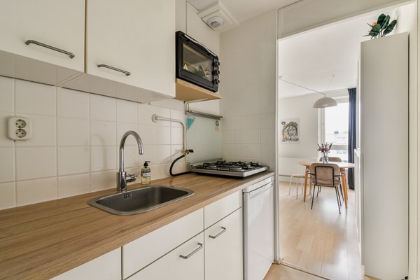 De lichte woonkamer ligt aan de achterzijde van het gebouw en biedt een fraai, vrij en groen uitzicht richting de Johan Cruijff Arena. De halfopen keuken is praktisch ingericht in een rechte opstelling en biedt mogelijkheden voor modernisering naar eigen smaak.