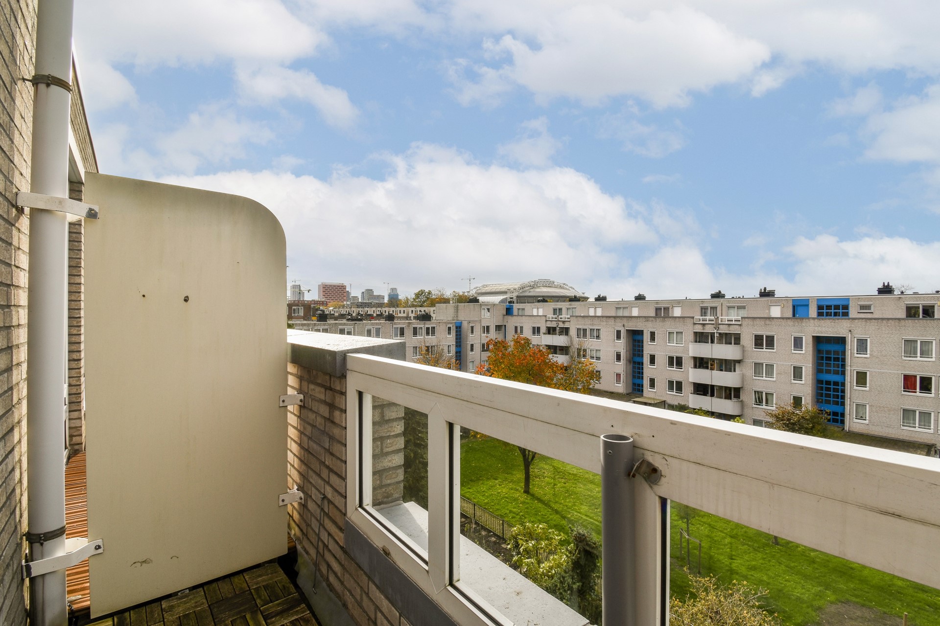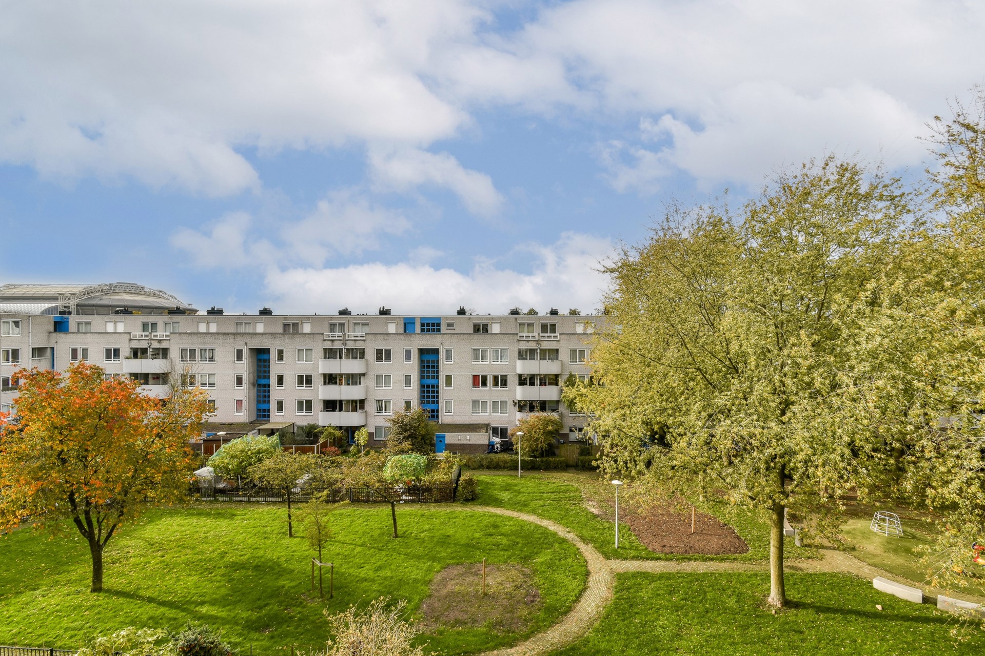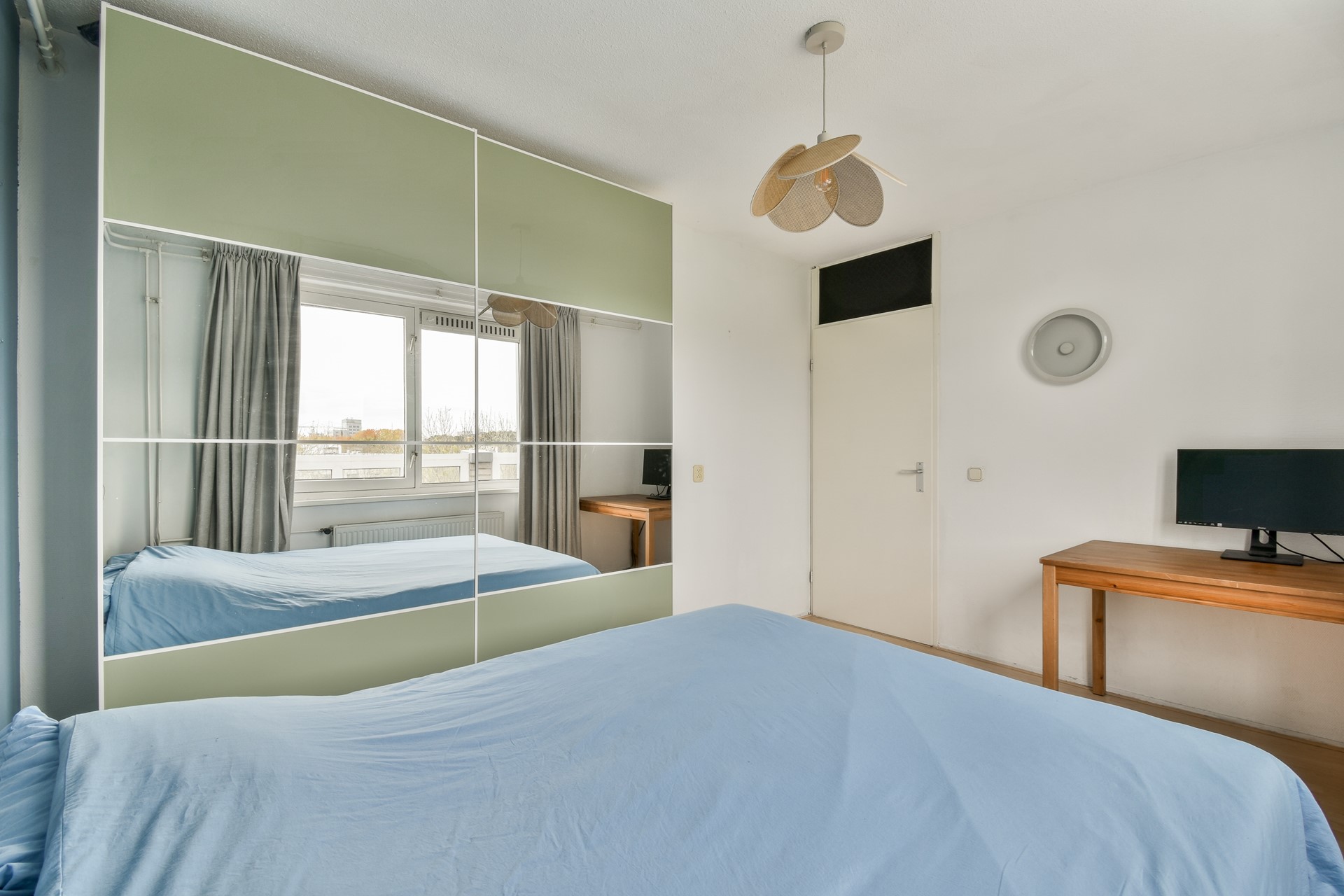De lichte woonkamer ligt aan de achterzijde van het gebouw en biedt een fraai, vrij en groen uitzicht richting de Johan Cruijff Arena. De halfopen keuken is praktisch ingericht in een rechte opstelling en biedt mogelijkheden voor modernisering naar eigen smaak.