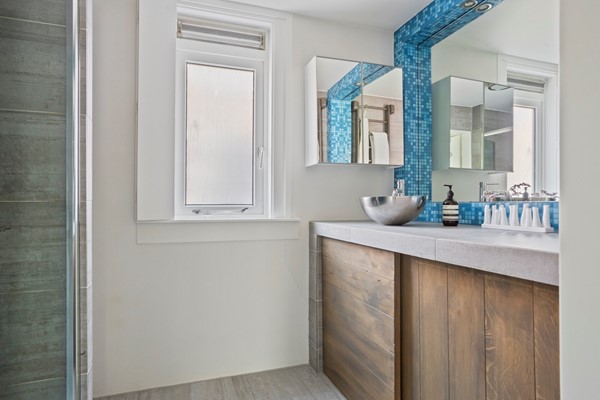 The modern white corner kitchen was renovated in 2017 and upgraded with a new anthracite countertop in 2025. Fully equipped with a combi oven/microwave, electric cooktop, extractor hood, dishwasher and fridge.