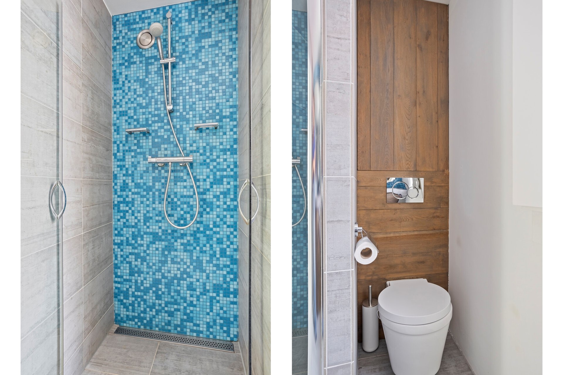 A surprisingly spacious bathroom with window, featuring a walk-in shower, modern toilet, hotel mirror, and comfortable underfloor heating. Built-in cabinets provide space for a washing machine or dryer.