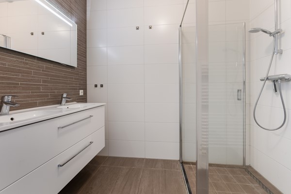 Verder beschikt de woning over twee goed bemeten slaapkamers, een badkamer met douche en dubbele wastafel, een separaat toilet met fonteintje, en een berging met aansluitingen voor wasmachine en droger.