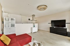 Aan de voorzijde van het complex bevindt zich de lichte woonkamer met open keuken. Dankzij de grote ramen en openslaande deuren naar het zonnige balkon op het zuidwesten voelt deze ruimte ruim en uitnodigend aan – een heerlijke plek om tot rust te komen.