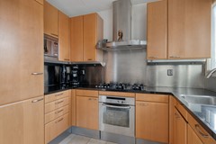 De halfopen keuken sluit naadloos aan bij de leefruimte en is voorzien van inbouwapparatuur, waaronder een vaatwasser, oven, magnetron, koel-vriescombinatie en gaskookplaat met afzuigkap. Het granieten werkblad voegt net dat vleugje extra toe.