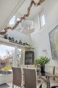 De woonkamer met hoge plafonds en raampartijen voelt luchtig en is ruim van opzet waarbij het eenvoudig is om zowel een comfortabele zithoek te creëren als een royale eetgedeelte – perfect voor diners of ontspannen avonden.