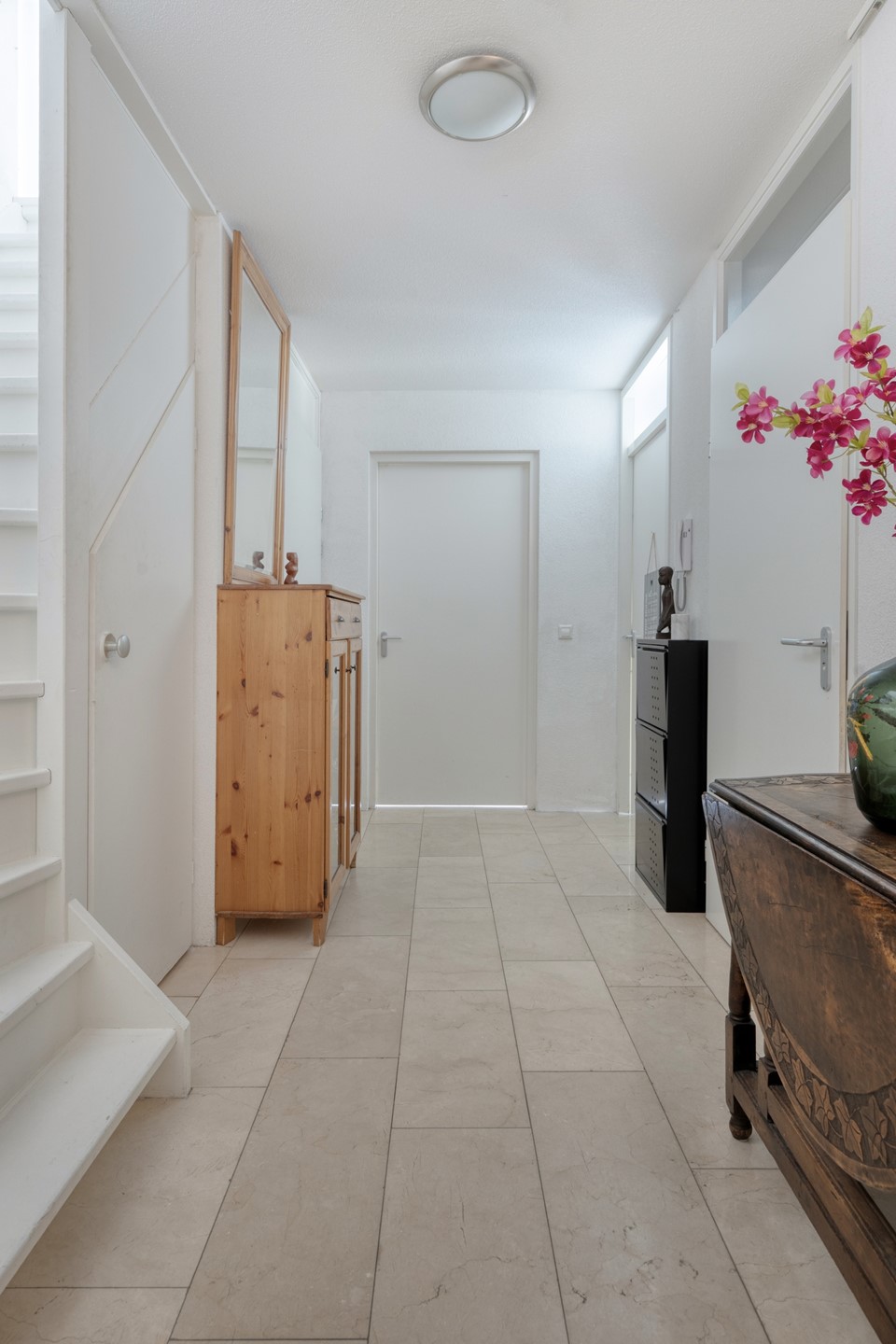 Vanuit de ruime hal is er toegang tot de woonkamer, slaapkamers, badkamer en opgang naar de tweede woonverdieping.