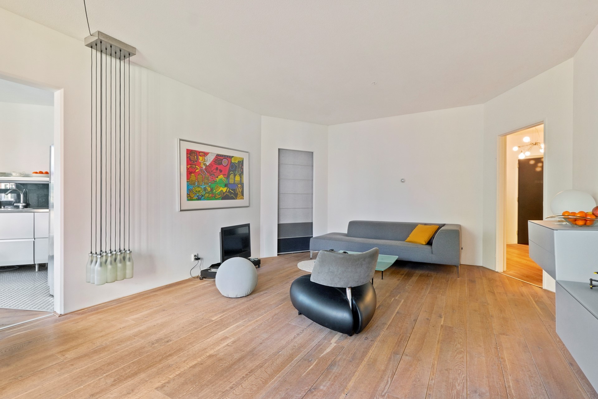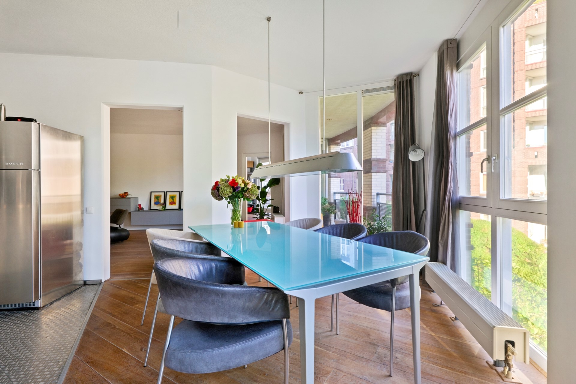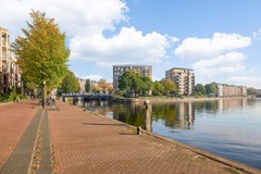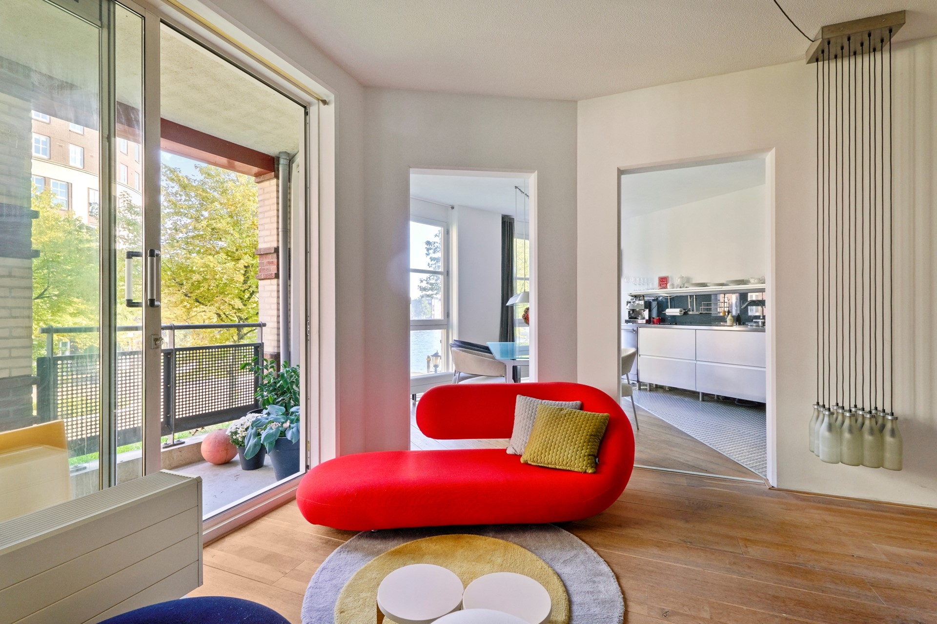 At the front, you’ll find the modern living room – the perfect place to relax and recharge after a busy day, with the added bonus of a wonderful view over the canal. From here, you can step directly onto the balcony, where you can enjoy the same beautiful scenery.