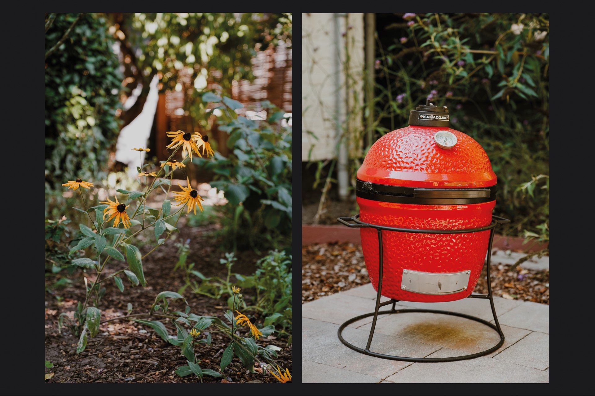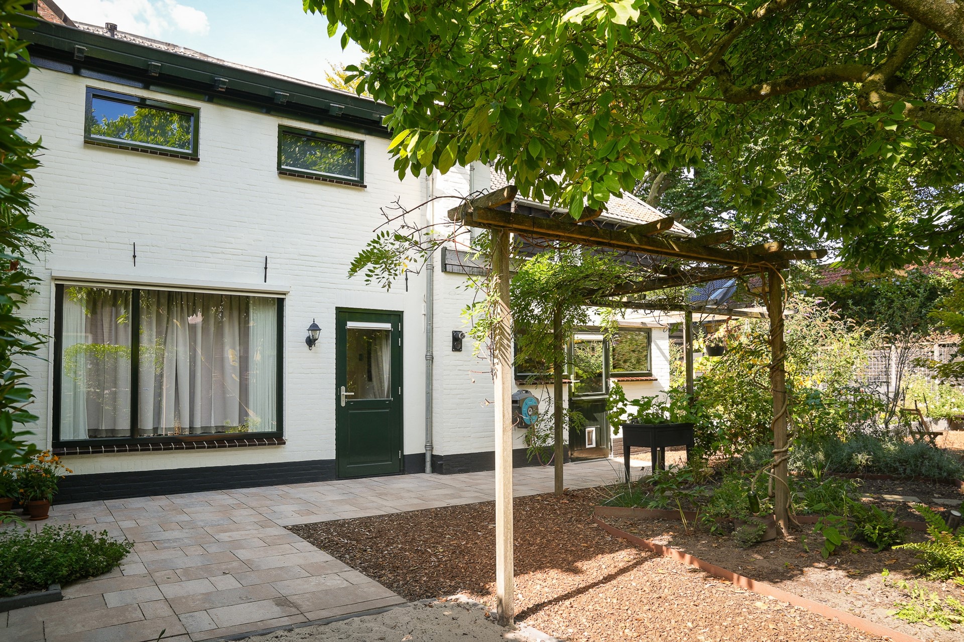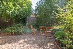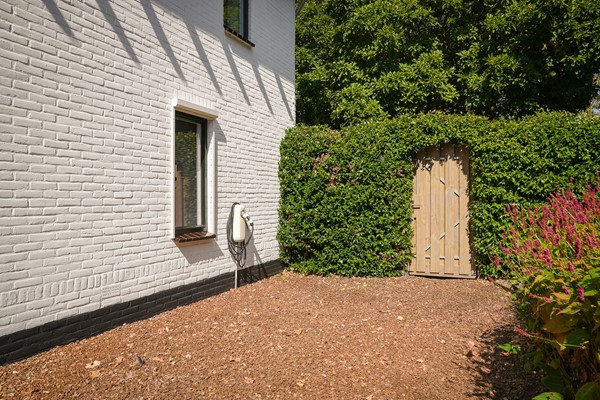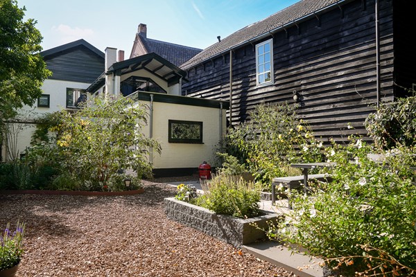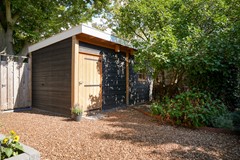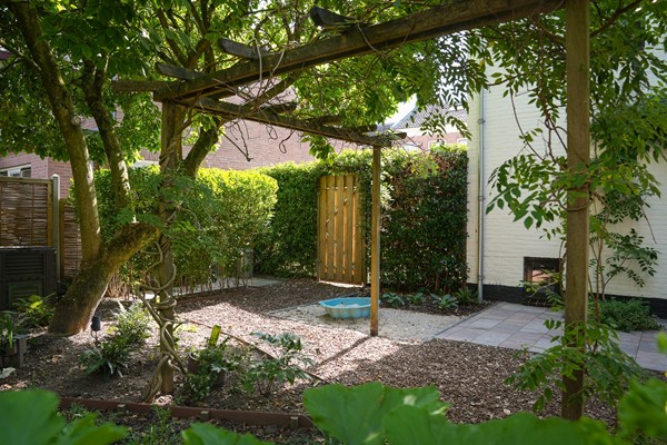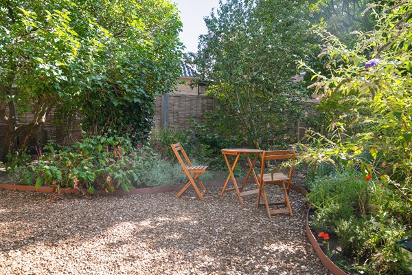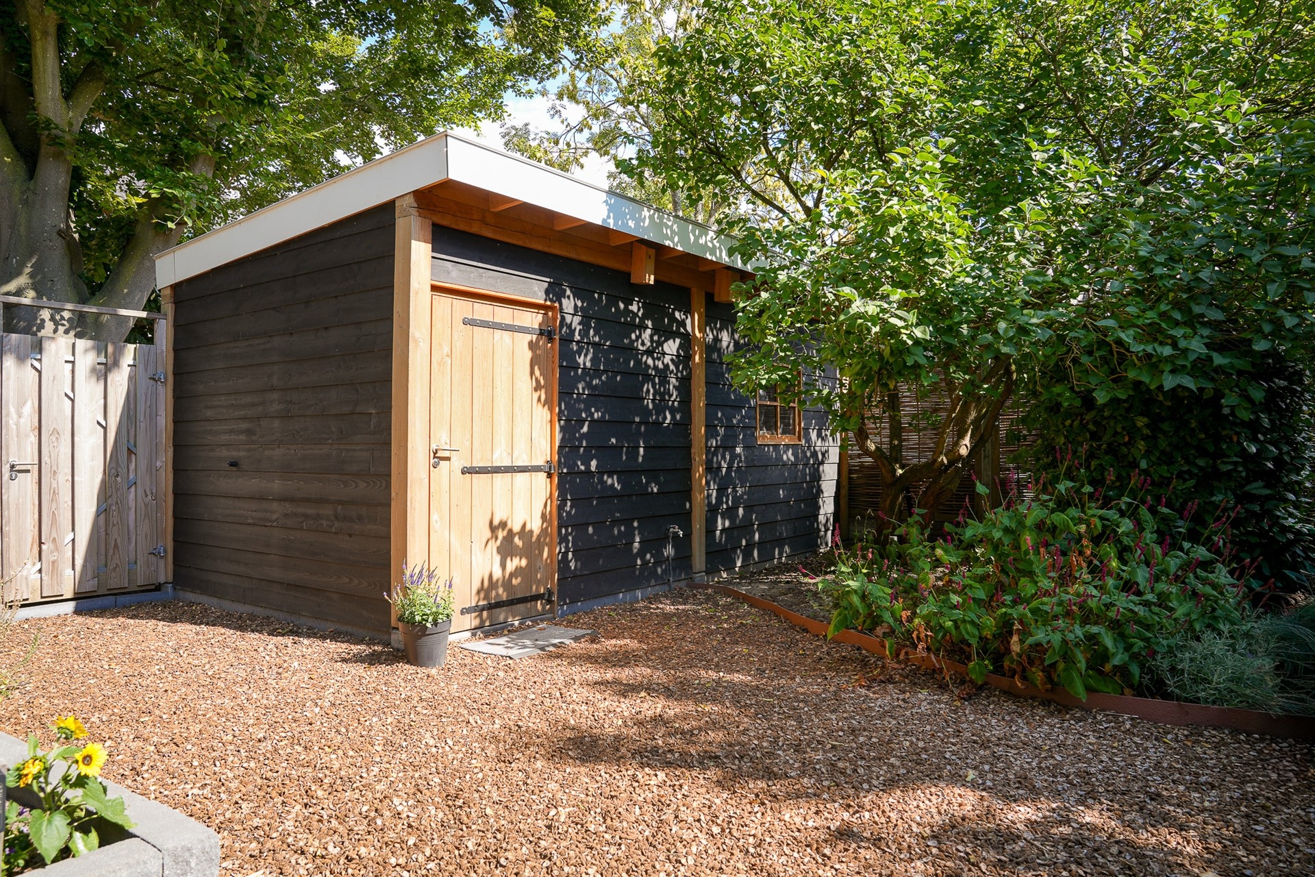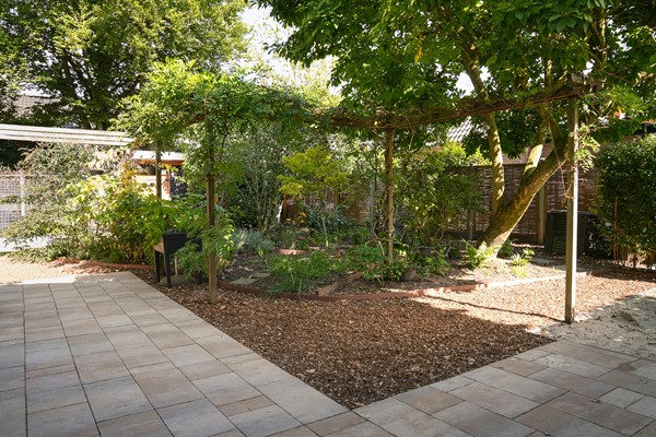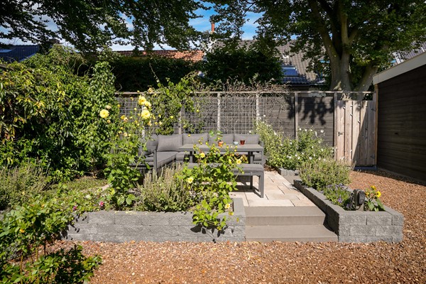 De achtertuin is in 2022 opnieuw gevarieerd aangelegd met diverse soorten beplanting, moestuin en bomen en voorzien van een moderne schuur.