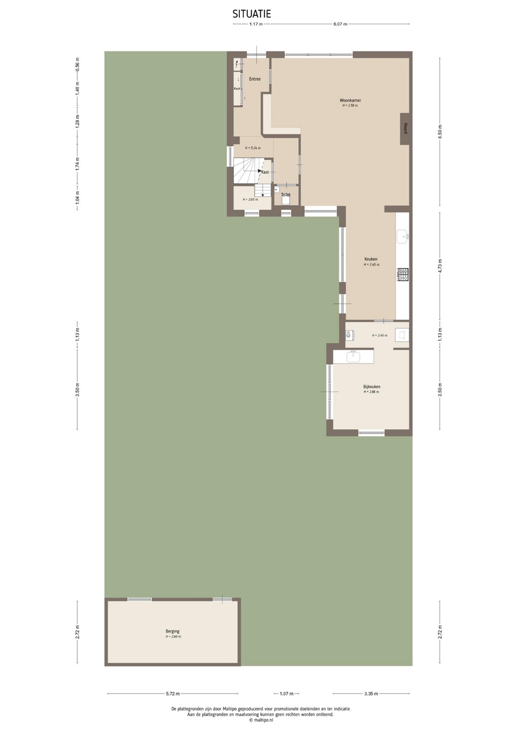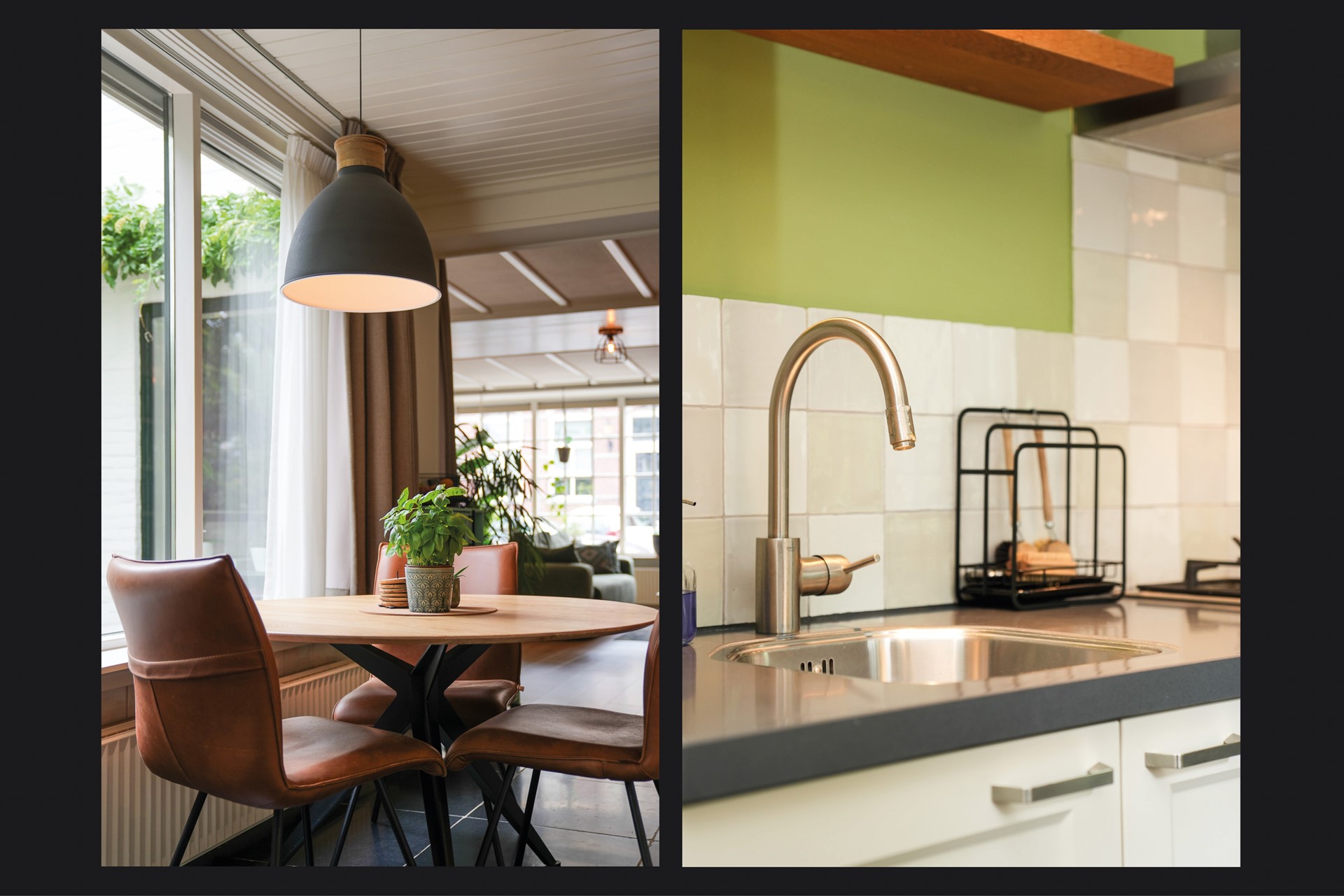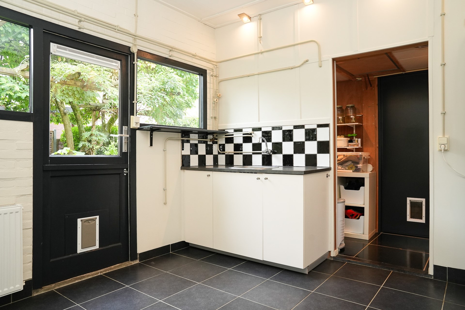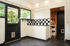 Daarachter ligt een grote ruimte met een keukenmeubel met spoelbak en koud water. Ook hier is een deur die naar de tuin leidt.