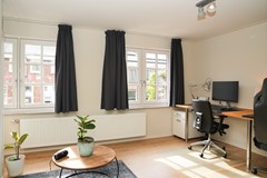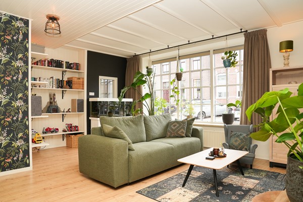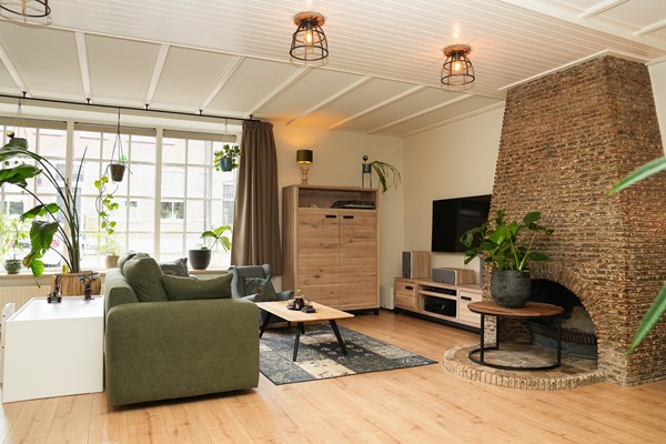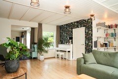 De woonkamer is ruim en licht door de grote raampartij aan de voorzijde. Aan de achterzijde biedt een raam een doorkijkje naar de tuin en daarnaast is via een open verbinding de keuken bereikbaar. Centraal in de woonkamer is de schouw.