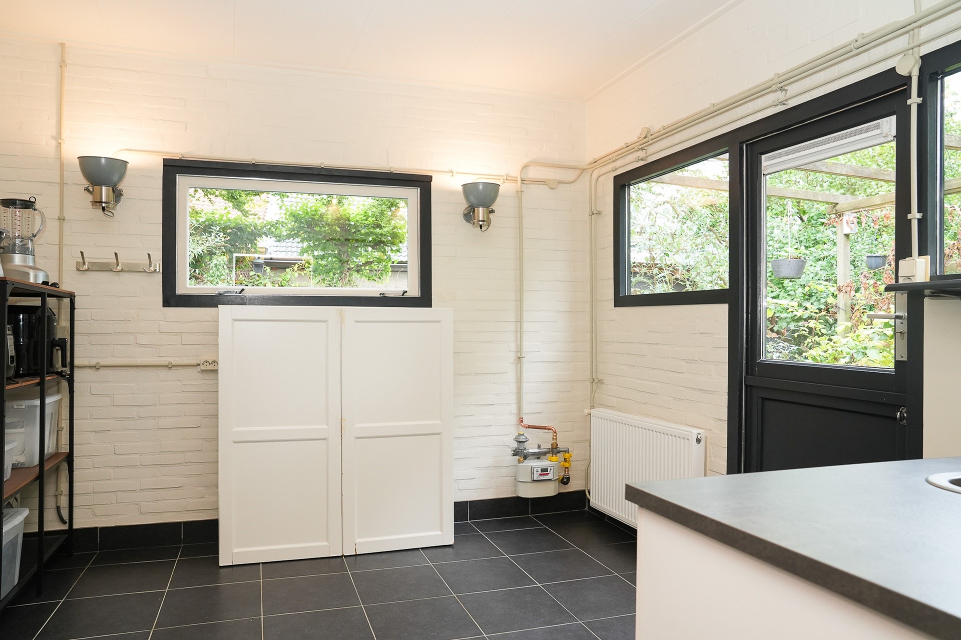 Een deur leidt naar de bijkeuken, waar in het voorste gedeelte de wasmachine en droger staan opgesteld en aan de andere kant de CV-installatie.