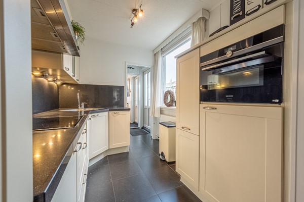 Aan de achterzijde van de woning vind je de keuken, die praktisch en verzorgd is uitgevoerd en voorzien van de benodigde inbouwapparatuur. Extra leuk detail: vanuit de keuken leidt een trapje naar beneden naar een enorme trappenkast/kelder, ideaal voor extra voorraad, opslag of zelfs een wijnkast.
