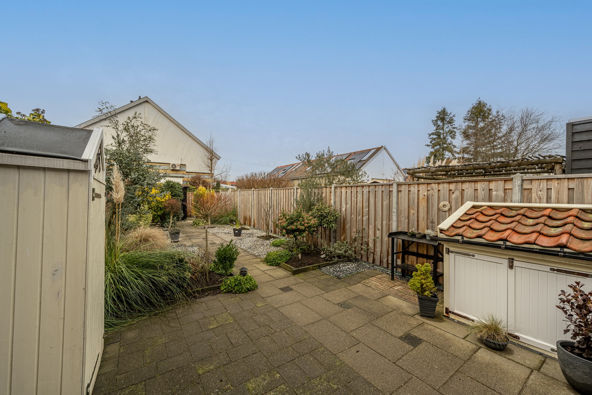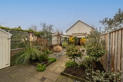 Via de achterzijde stap je zo de diepe achtertuin in. Deze tuin is met zorg aangelegd en in 2025 opnieuw bestraat, waardoor het geheel strak en onderhoudsvriendelijk is. Je vindt hier meerdere fijne plekken om te zitten én er is volop praktische bergruimte aanwezig. Achter in de tuin staan een schuur en een extra blokhut – ideaal voor fietsen, gereedschap en hobbyspullen – en bovendien is er stroom aanwezig.